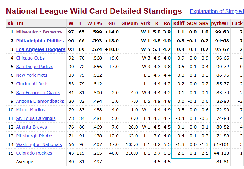Explanation for those unfamiliar. "RDiff" is run differential per game; "SOS" stands for Strength of Schedule, and is the average run differential per game of a team's opponents; "SRS" stands for Simple Rating/Ranking System, and is the sum of the two previous numbers.