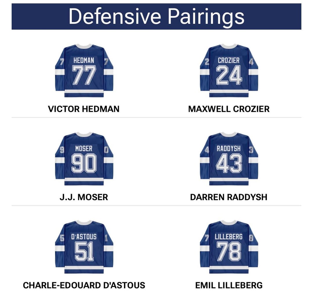 The broadcast team made the similar statement. Moser/Raddysh pairing has been very successful. Coop wants to keep the chemistry. Labeling Hedman as #1 is about respect for the captain. The players have been playing unselfish hockey.