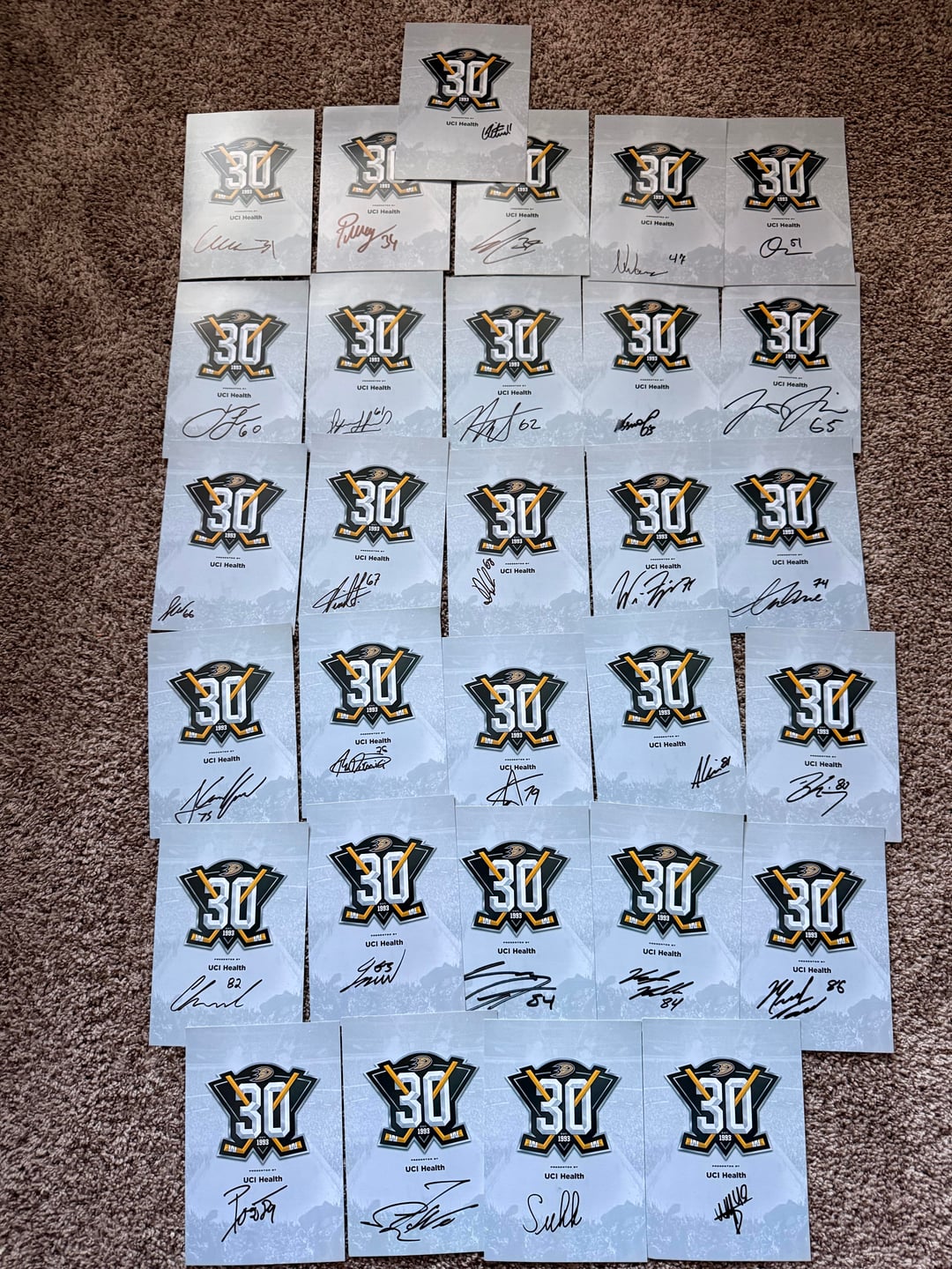 I recently purchased a blind lot of duck memorabilia. I got this lot of 30 30th anniversary signatures. I have no clue what these are from. I imagine it was an Orange Alliance event in 2023 since the bomber jacket from that year was also in this lot.