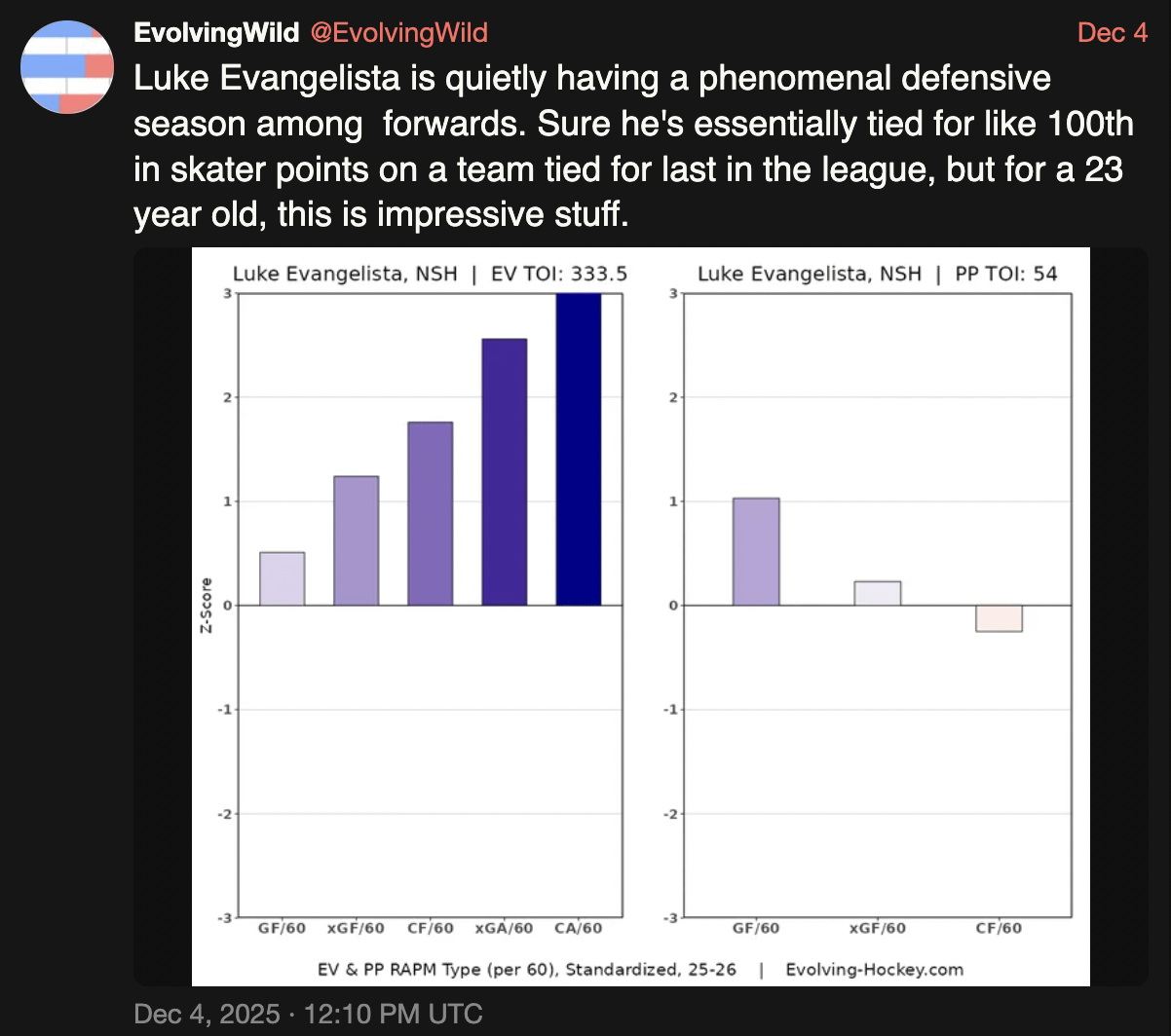 [Evolving Wild] Luke Evangelista is quietly having a phenomenal defensive season among forwards. For a 23 year old, this is impressive stuff.