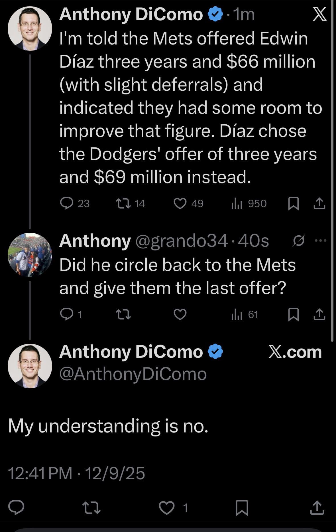 [DiComo] Diaz did NOT give the Mets a chance to match the Dodgers offer