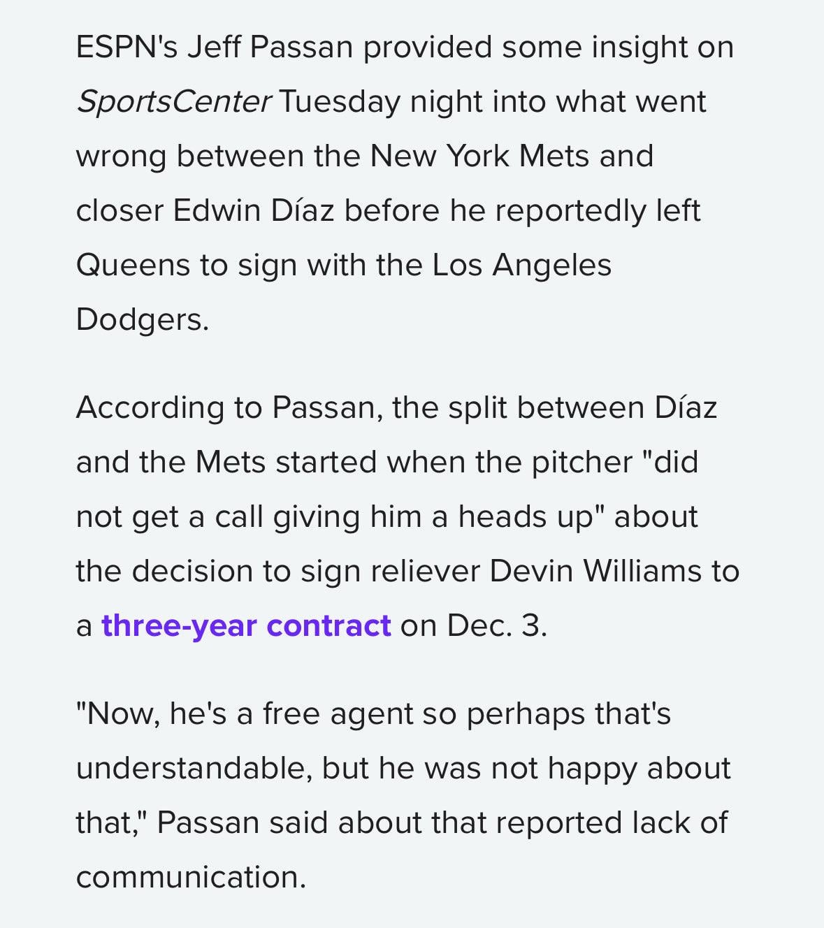Being kept in the loop is courtesy for a guy like Diaz. Signing an elite reliever and prior to that offering diaz 3 years expecting he wouldn’t have offers is strange. The Mets were applauded for their communication a year ago. It didn’t appear to be the case here.
