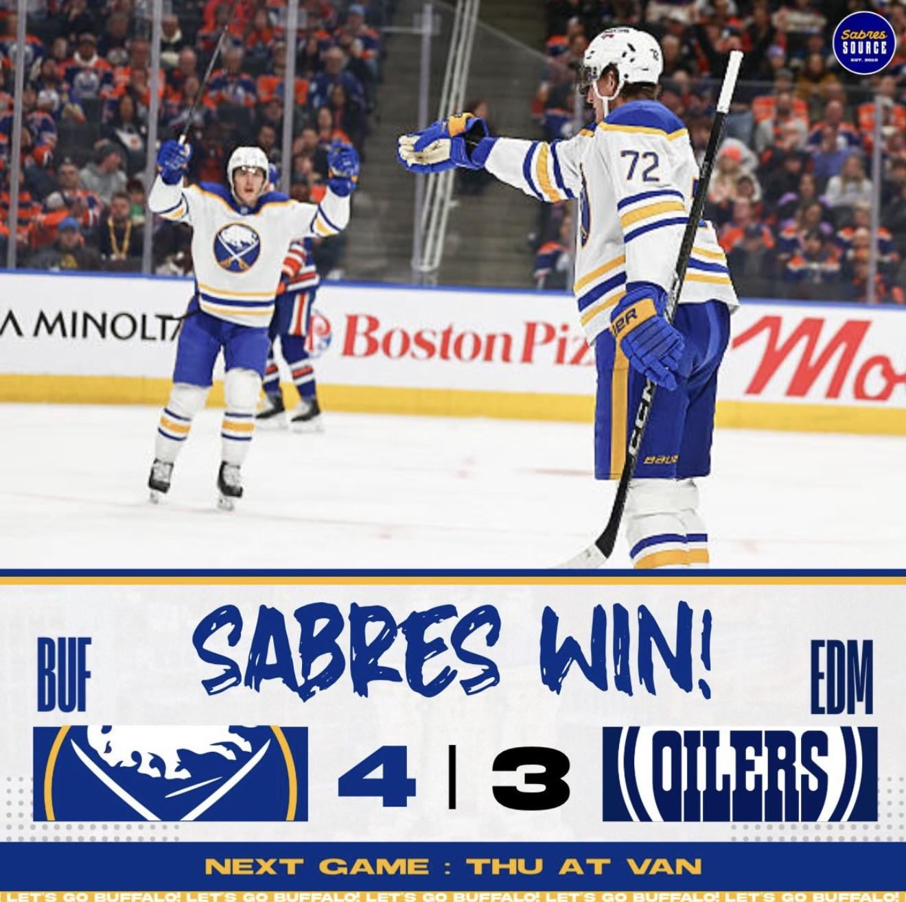 Sabres hang on in a thriller, 4-3 OTW @ Edmonton and up next is Vancouver on the road.