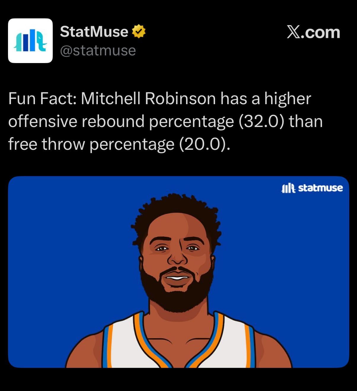 Mitchell Robinson’s career FT% is still higher than Wilt Chamberlain, and only ranks #15 on the all time worst career numbers (Minimum 400 attempts)