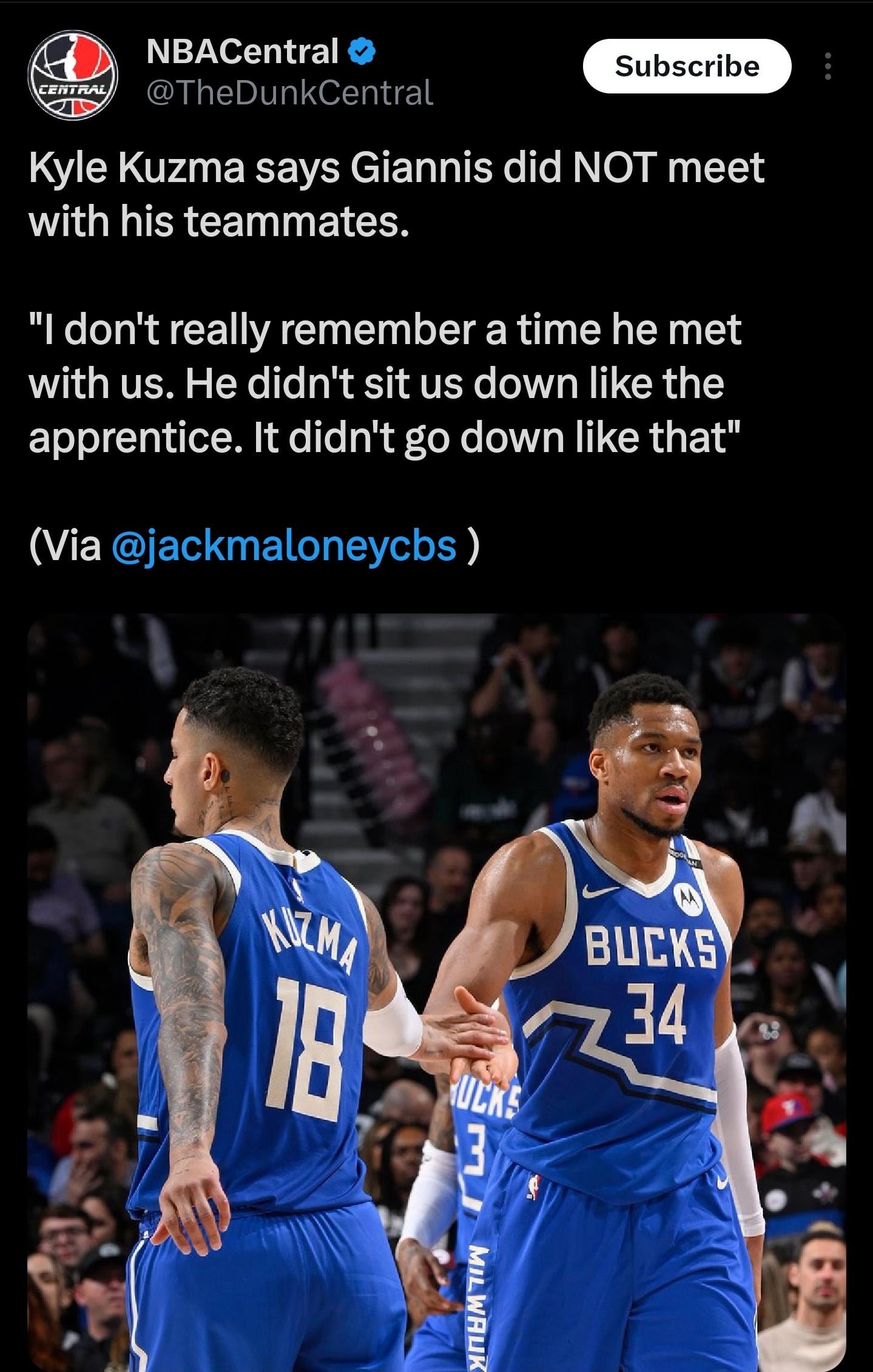 I think the whole narrative that many of us want to believe, which is that Giannis is the teams franchise player and team leader might not actually be true. Maybe he’s checked out. The rumblings have been there. Kuzma isn’t the first to say something like this. Maybe it really is time and Giannis despite knowing it,