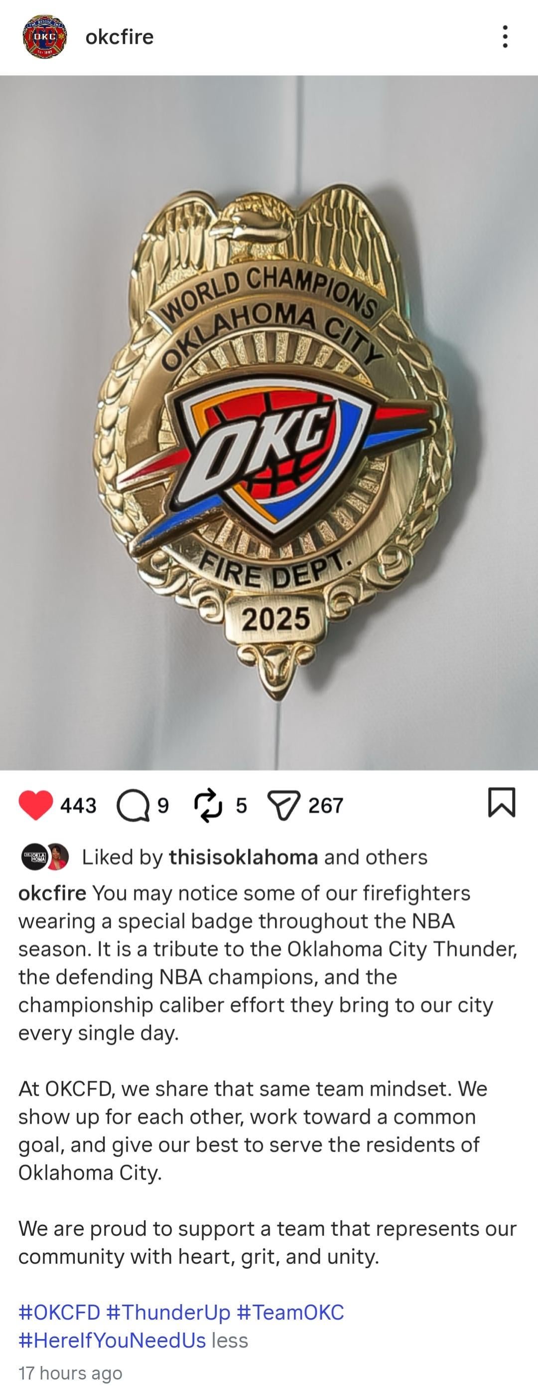 OKCFD is wearing commemorative Thunder badges.