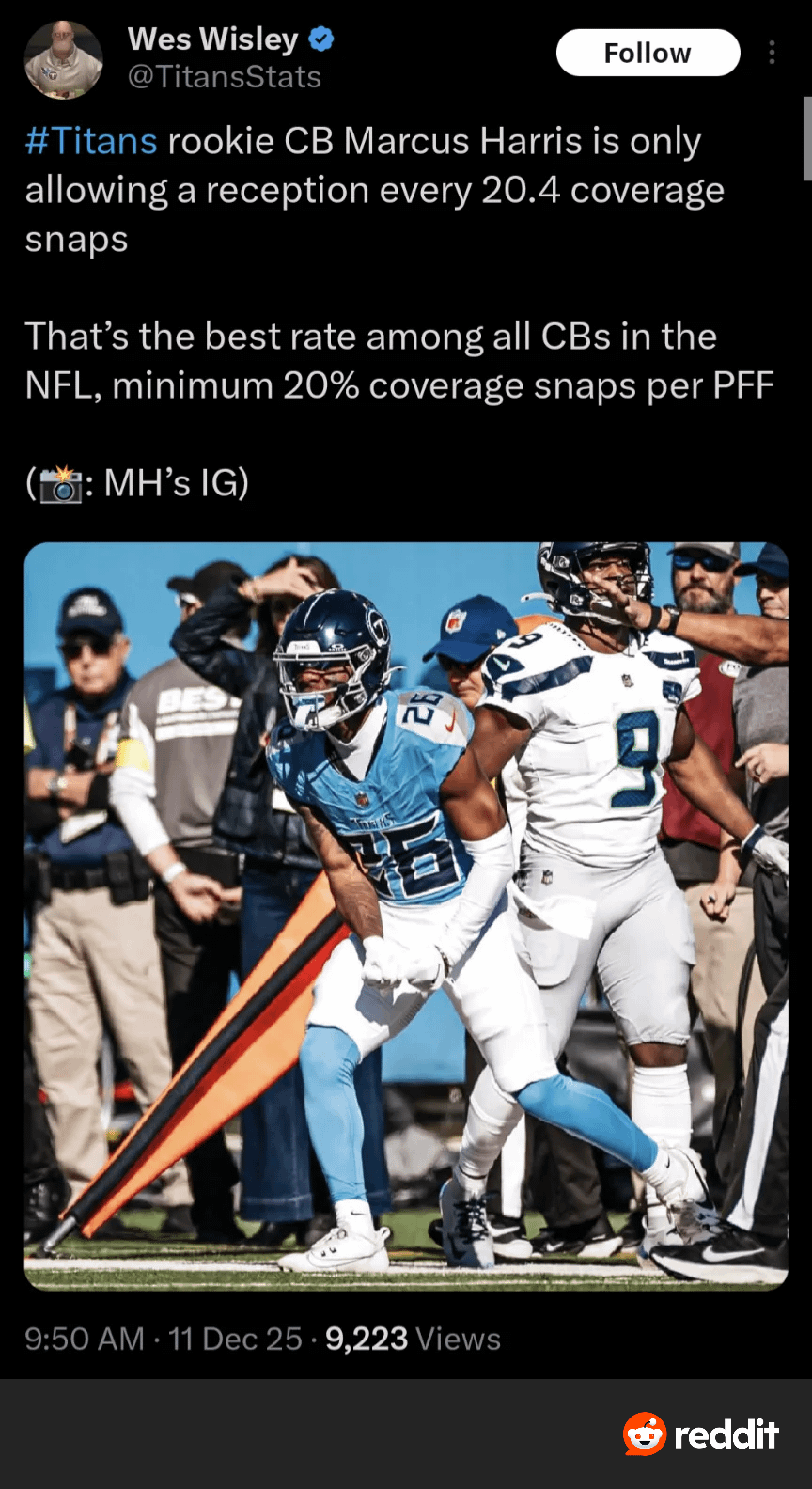 Its early to start making big claims, but Harris is absolutely killing it. It would be huge to have a top corner going into 2026 considering the situation at that position, and that we had no idea what we had a handful of weeks ago. Based on KCs massive success finding elite DBs with day 3 picks, I dont think its a fluke either – Borgonzi knows how to draft in thr backfield.