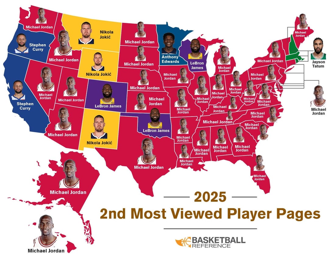 Context: You asked to see who the second most viewed players were in 2025, so the map wouldn’t just be 47 states of LeBron … now it’s 38 states of MJ.
