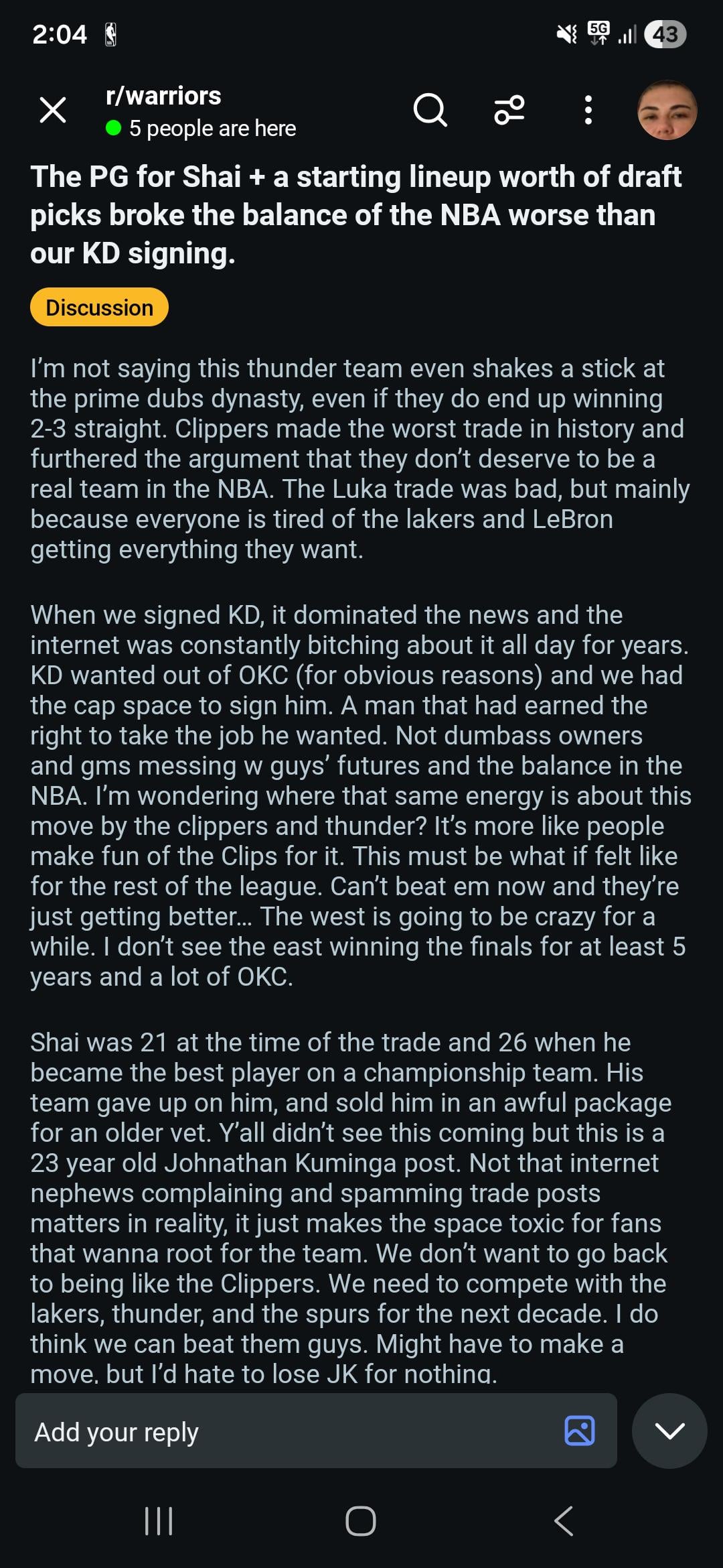 Look, everyone hates us. But… no one is on the Warriors’ side complaining about stacking a team. The shit was a decade ago, not the 1970s. Is this person crazy?