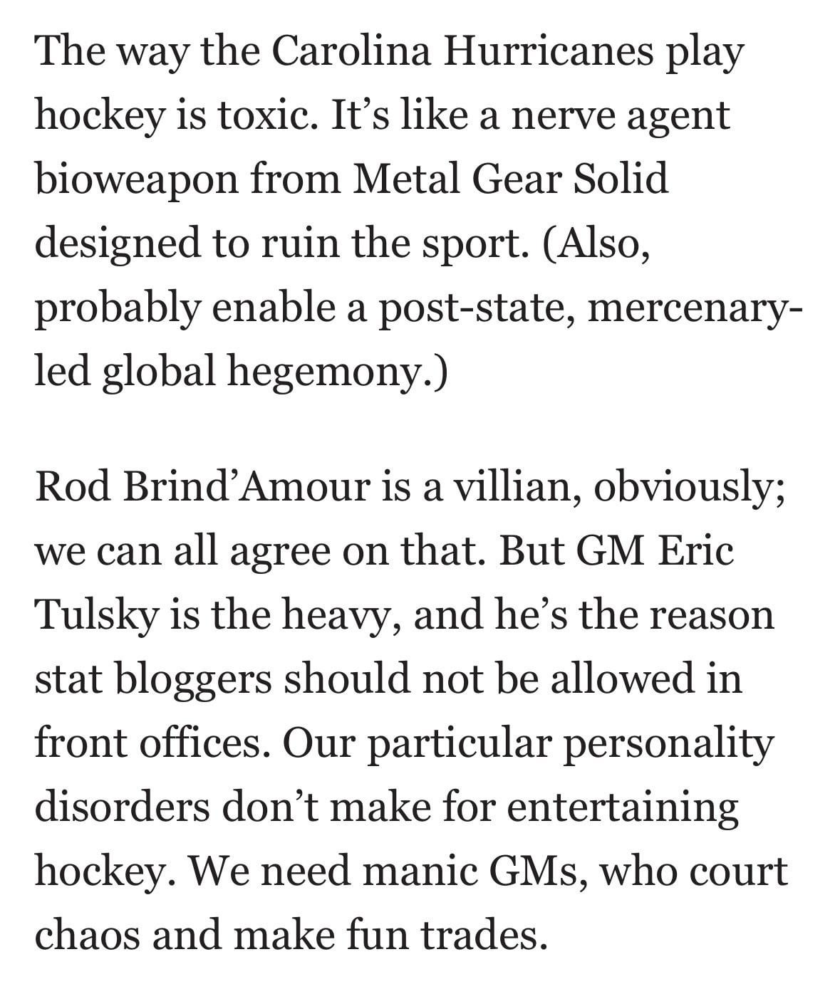 Tulsky is a boring GM who doesn’t court chaos and make fun trades? That’s hilarious given that all last season he was being called crazy after he traded Necas during a career year for Rantanen without a guarantee that Rantanen would sign, then flipped him for a pint-sized rookie and an over-the-hill former MVP plus picks.
