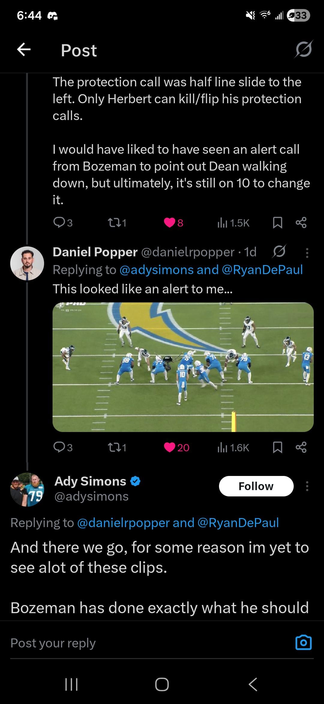 So this former NFL OL and popper were talking a bit on twitter of what went wrong with this free rusher on the 2nd drive of the game, and hinted that Bozeman did his job by alerting herb of the possible free rusher, but herb failed to slide the protection. I know its very taboo to even consider Bozeman getting something right and herbert getting it wrong, but I am a seeker of the truth. Herb also took responsibility (as always) for not setting up proper protections. I would like to hear EDUCATED opinions on this matter. Do not come in here just blaming Bozeman if you do not know how protections work please, because im actually curious of the true issue here, which is not always Bozeman Bozeman Bozeman 🤦