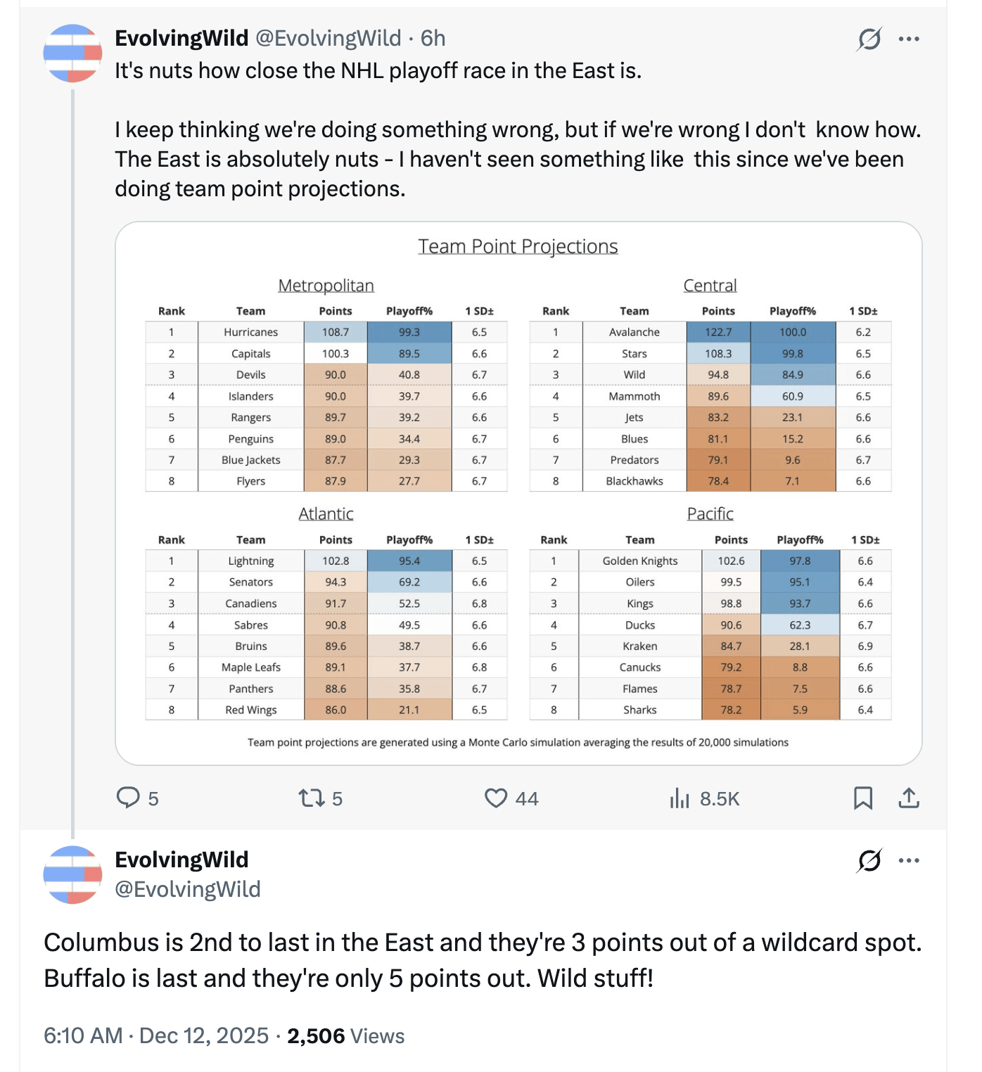 [EvolvingWild] It’s nuts how close the NHL playoff race in the East is. I keep thinking we’re doing something wrong, but if we’re wrong I don’t know how. The East is absolutely nuts – I haven’t seen something like this since we’ve been doing team point projections.