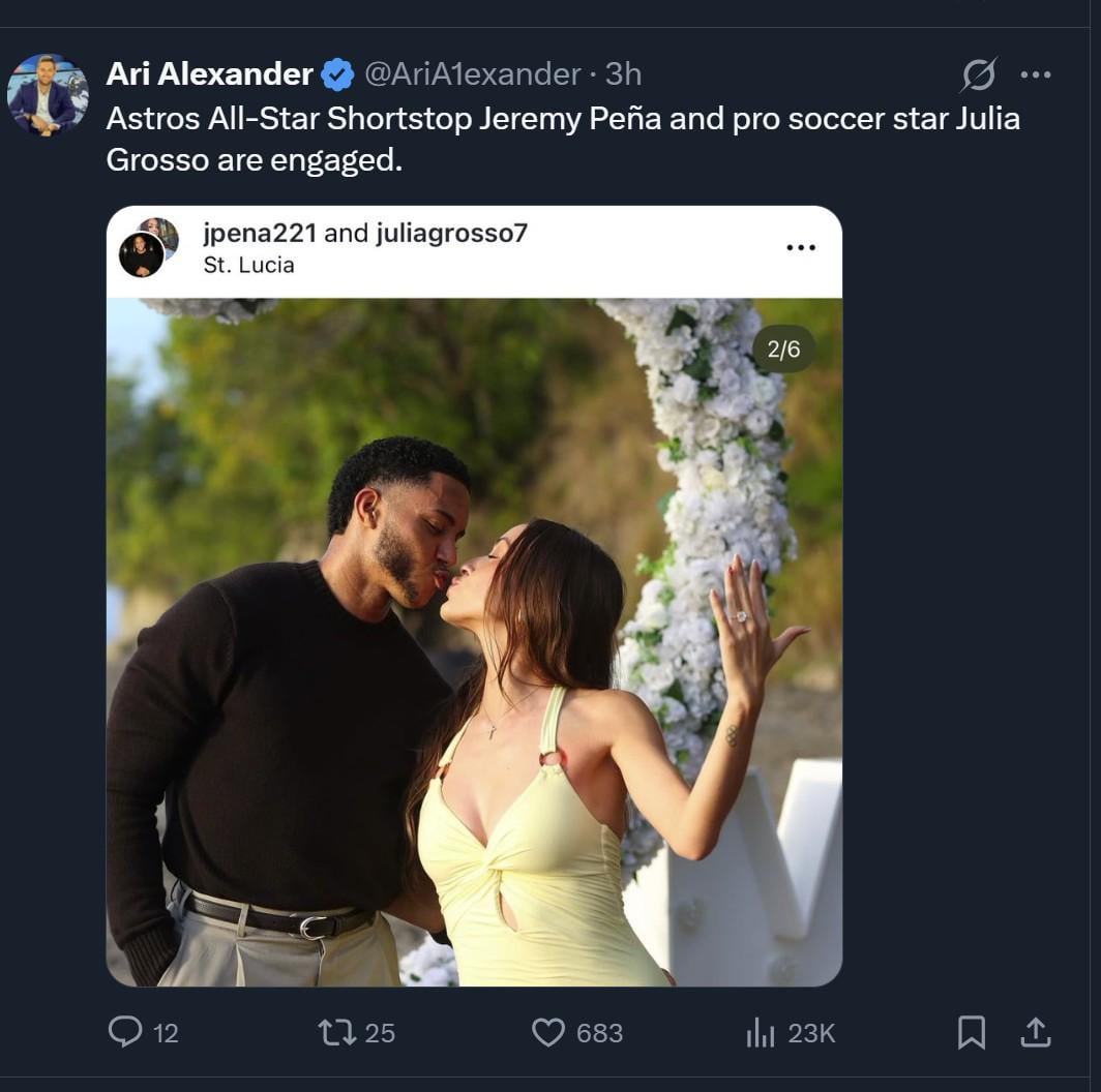 Astros All-Star Shortstop Jeremy Peña and pro soccer star Julia Grosso are engaged. 1 comment Congrats to the happy couple! Leave a ReplyYou must be logged in to post a comment.