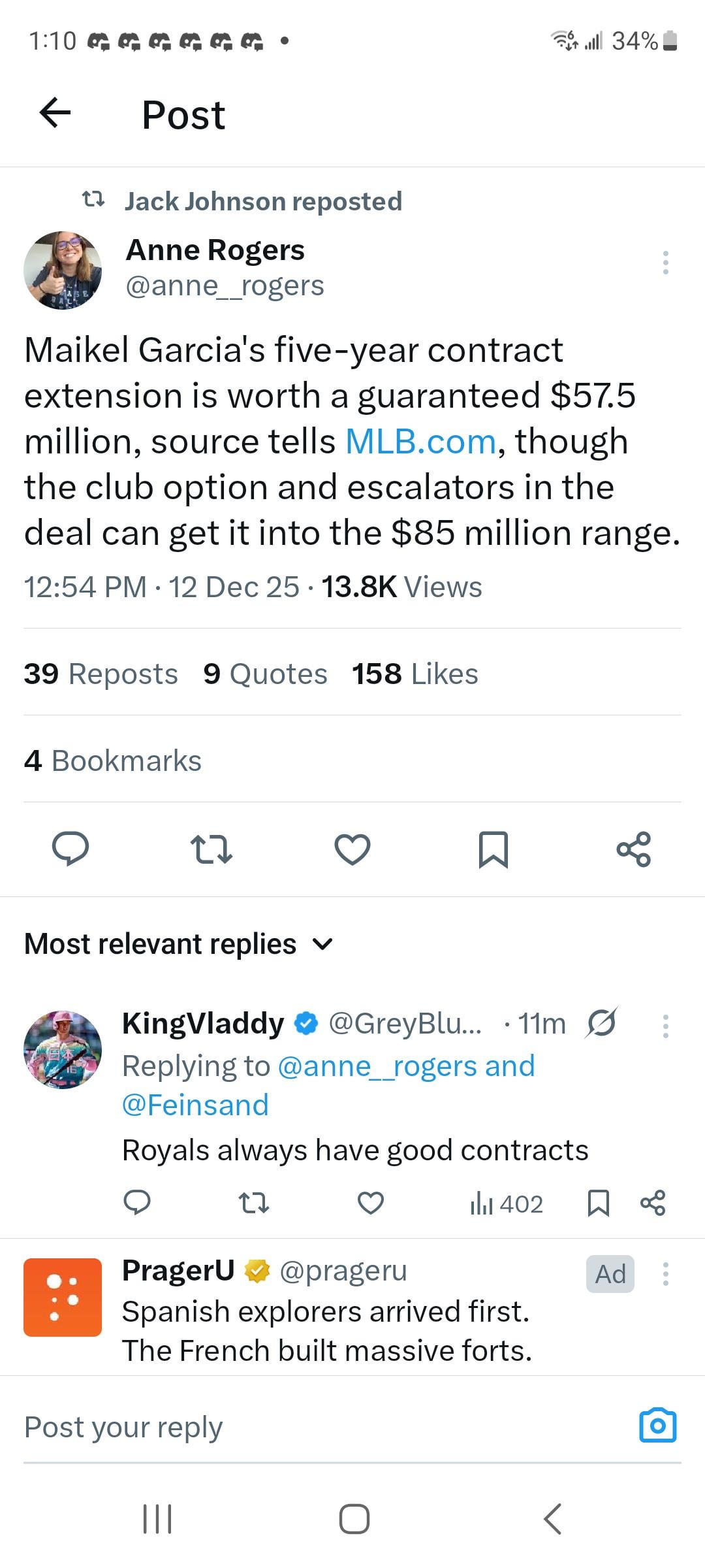 (Rogers) Maikel Garcia’s five-year contract extension is worth a guaranteed $57.5 million, source tells MLB.com, though the club option and escalators in the deal can get it into the $85 million range