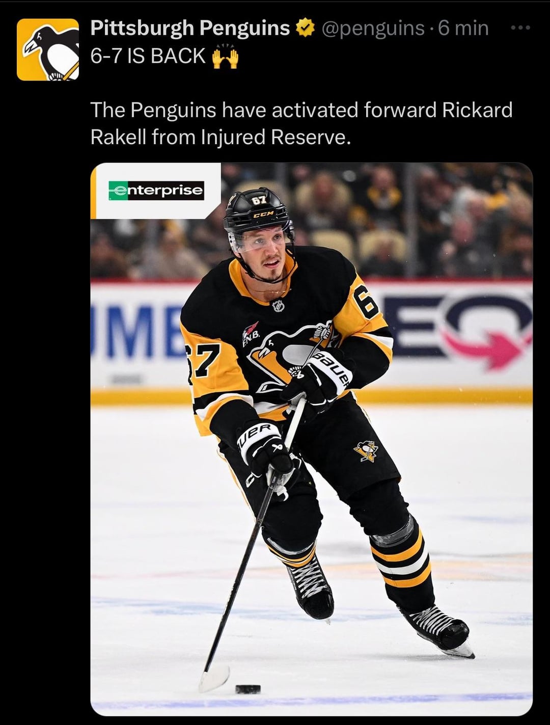 [Penguins] The Penguins have activated forward Rickard Rakell from Injured Reserve and have loaned defenseman Harrison Brunicke to Team Canada (World Junior Championship).