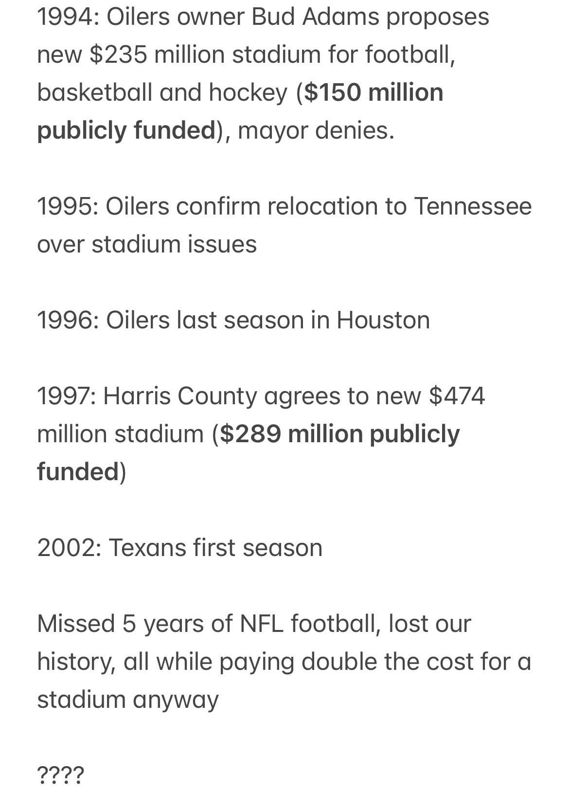 Never forget that if you were a Harris County taxpayer any time until 2014, you were still paying for Bud Adams’ Astrodome “upgrades” from *1988*. Fuck Adams and the oilers and everything that organization stands for.