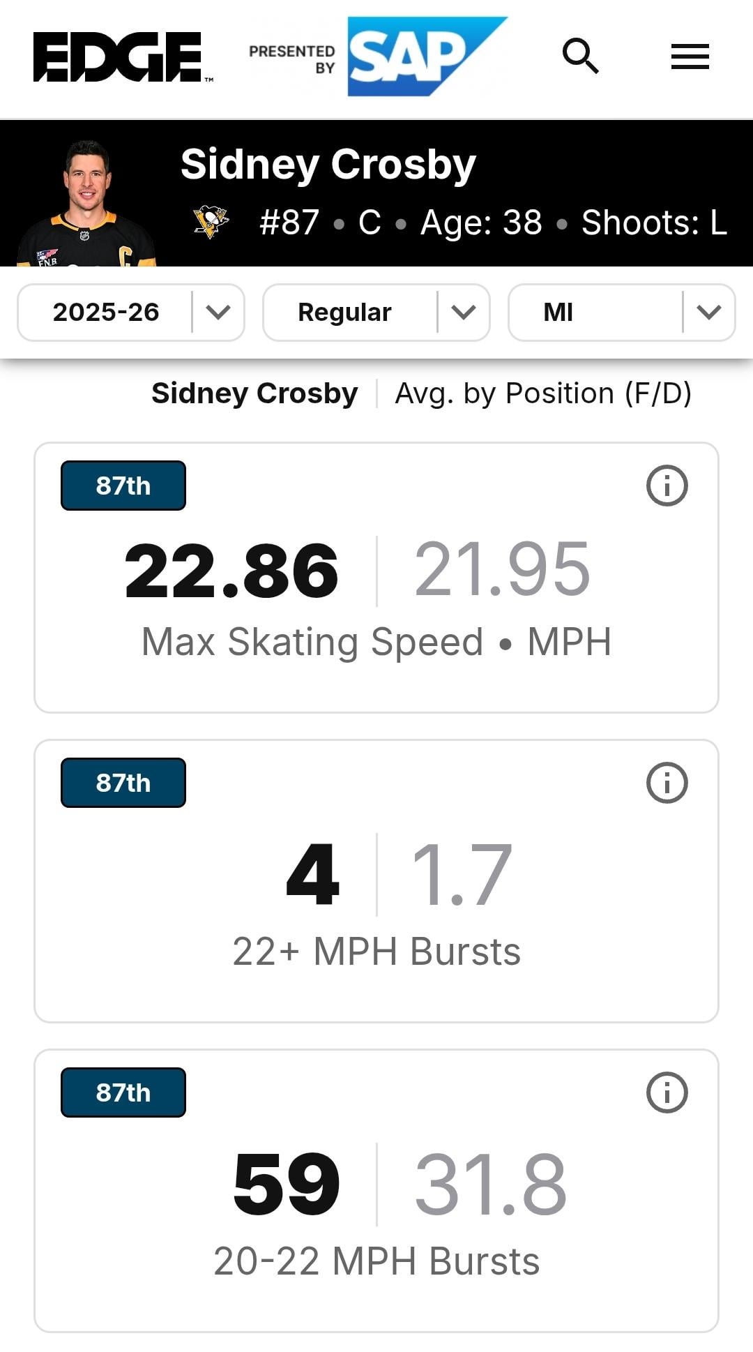 Per NHL Edge, Crosby is currently in the 87th percentile for max skating speed, the 87th percentile for 22+ mph bursts, and the 87th percentile for 20.22+ mph bursts.