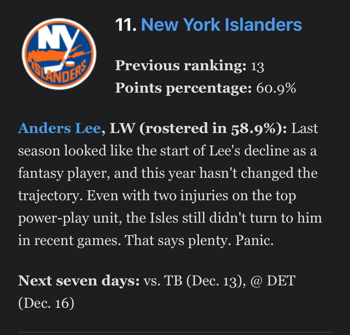 7. Yea this seems like a fantasy ranking which I’d 100% agree that Lee isn’t really someone I’d roster in a 10 or 12 team league. And as for being 11, I wouldn’t worry about that. I assume they have the three central leaders, Carolina and Washington ahead. Likely Vegas too and maybe Anaheim too. That would put us at 7. That’s not an egregious ranking if a little too low. They also seem to go based off points percentage