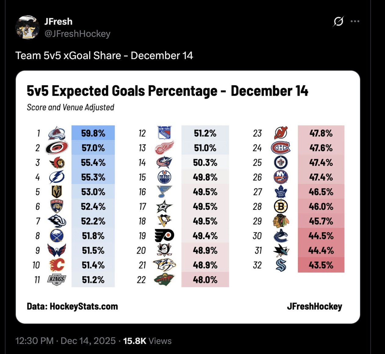 if you had told me before the season started that the Sabres would be a top 10 team in 5v5 xG%, I would’ve thought things were going great.