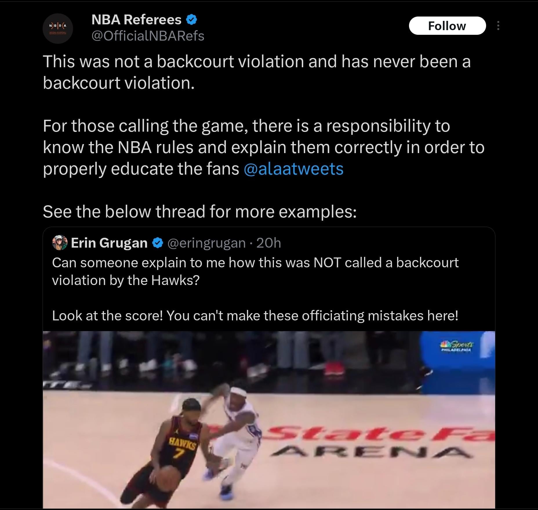@OfficialNBARefs making it clear that this was NOT a backcourt violation last night. (It’s about momentum)