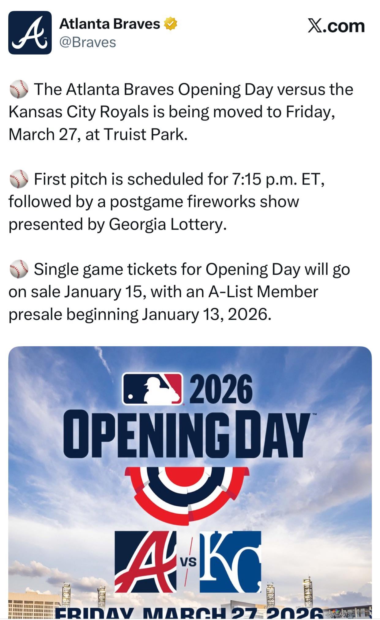[Braves] The Atlanta Braves Opening Day versus the Kansas City Royals is being moved to Friday, March 27, at Truist Park. First pitch is scheduled for 7:15 p.m. ET, followed by a postgame fireworks show presented by Georgia Lottery.