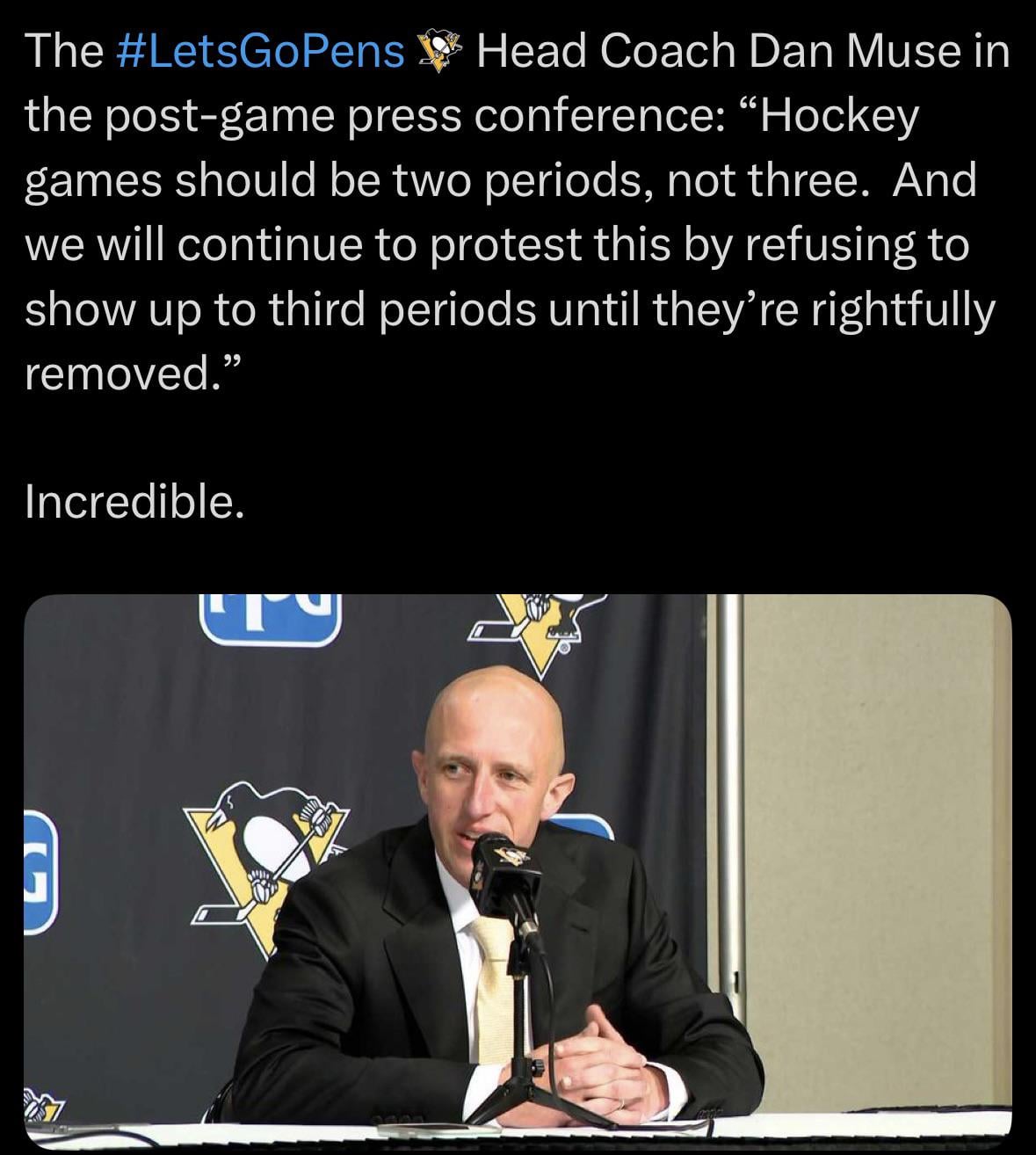 I get it. Hahaha. But , I really don’t think it’s funny. 7 comments It’s not funny. He’s a garbage coach and should be fired immediately it’s a good thing you don’t think it’s funny because he didn’t say it It’s funny because it’s true. Lmaoo ngl that’s actually pretty funny. If we can’t laugh at ourselves it will only get worse. Modern day Therrien quote lol. What is the reason Pens keep giving up 3rd period leads? Is it age? Are they gassed and can’t keep it up? Wait is this real? lol Leave a ReplyYou must be logged in to post a comment.
