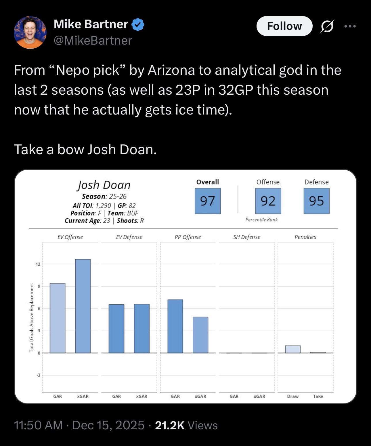 [Mike Bartner] From “Nepo pick” by Arizona to analytical god in the last 2 seasons (as well as 23P in 32GP this season now that he actually gets ice time). Take a bow Josh Doan.