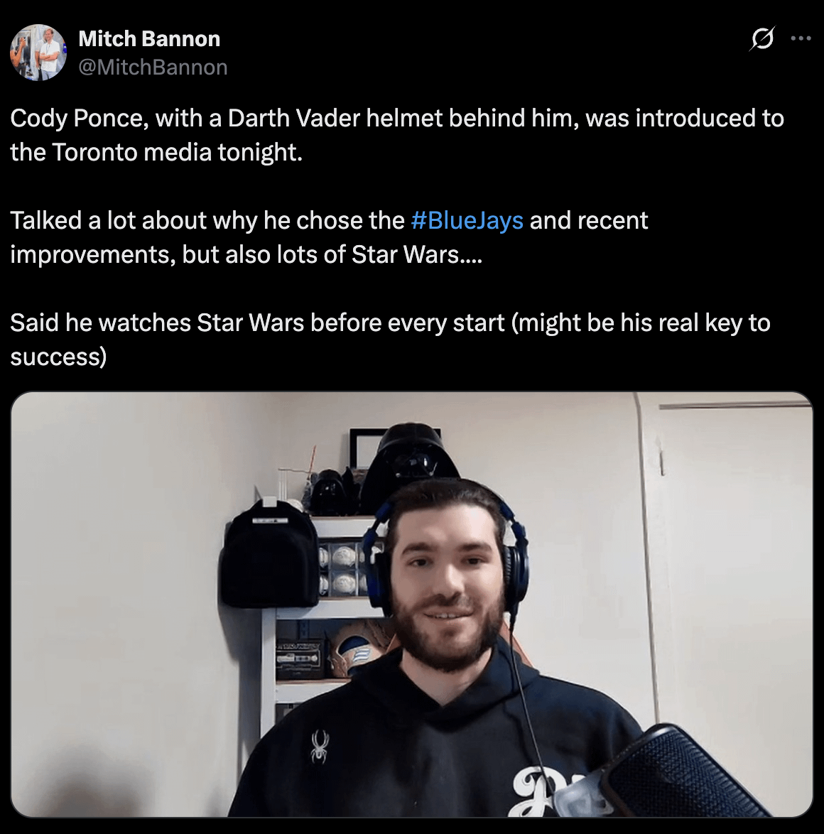 [Bannon] Cody Ponce, with a Darth Vader helmet behind him, was introduced to the Toronto media tonight. Talked a lot about why he chose the #BlueJays and recent improvements, but also lots of Star Wars…. Said he watches Star Wars before every start (might be his real key to success)