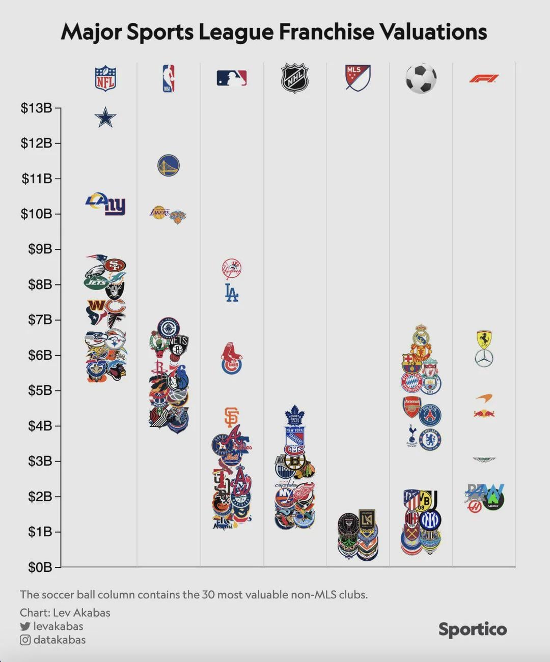 I’m also a little shocked at the value of all the NBA teams. I didn’t think they were doing that well that almost the entire league is ahead of MLB, and also ahead of quite a few major soccer teams. Like if you told me earlier today that that the Houston Rockets are worth more than PSG, Bayern Munchen, and Arsenal I would have thought that was insane.