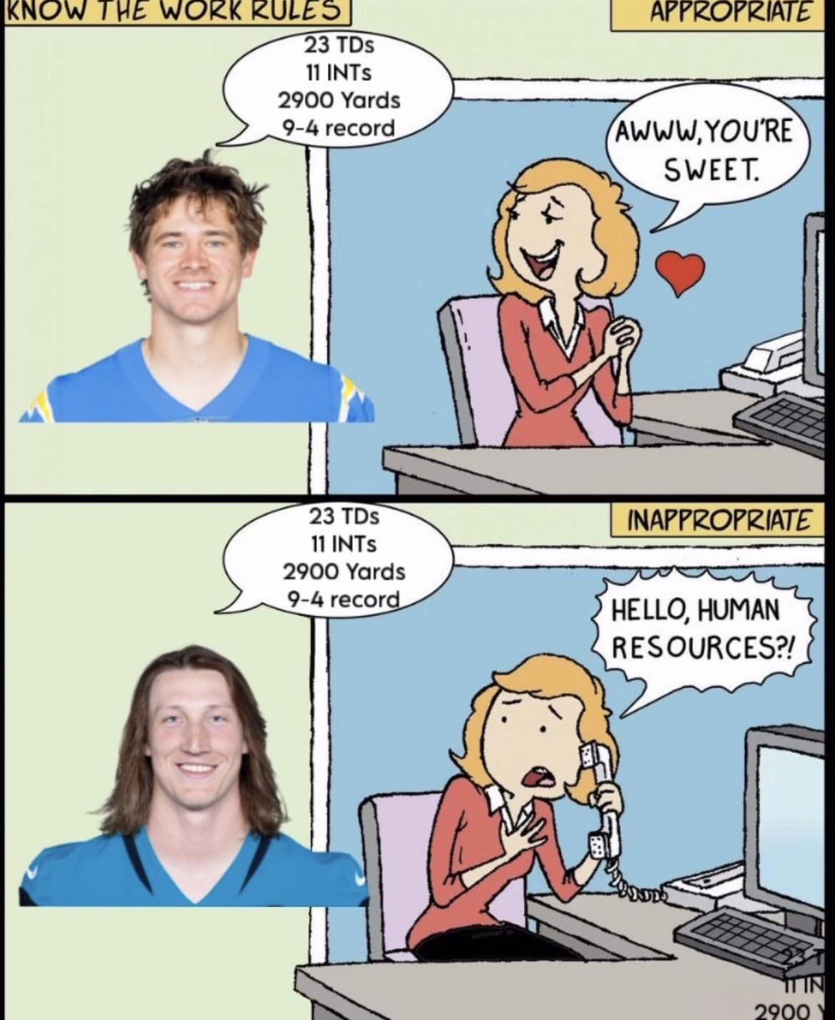 Leaving this here 18 comments It’s from the looks. Media loves to cream over athletic Brad Pitt, not the hair conditioner caveman. Herbert is working with this and still producing https://preview.redd.it/6gle4xk8cn7g1.jpeg?width=1065&format=pjpg&auto=webp&s=752fa50f9395e4b08a831d088a7e777e69b8af61 Herbert has been playing injured behind an offensive line held together with scotch tape and prayers. https://youtu.be/Sv1We7Eh2pE?si=MovDOlYNEEbJVU_n But instead of Taylor Hanson, Trevor Lawrence I’ve been paying attention to the jags all that much but did they only get it together after their super uber hyped rookie got injured? Its the hair Let’s not forget [Tom Brady](https://youtu.be/PxuUkYiaUc8). It’s cause *girls have cooties.* Both of them have been playing well Half of Lawrence’s numbers came against the jets https://preview.redd.it/zhk4sccavn7g1.png?width=640&format=png&auto=webp&s=5a77743d4675cc0ea66a6a667e54aac77aa9ec5a These two have a chance to turn the AFC Championship game into the funniest thing… It’s the same picture Honestly they seem more equal as time goes on Tbf, Lawrence just threw 6 TD’s last weekend, so more than 26% of his TDs this season came in a single game. I got it! It’s the hair! It’s always about the hair! This is objectively false…there is no narrative that doesn’t dump on herbert It’s the hair. It’s always the hair. Leave a ReplyYou must be logged in to post a comment.