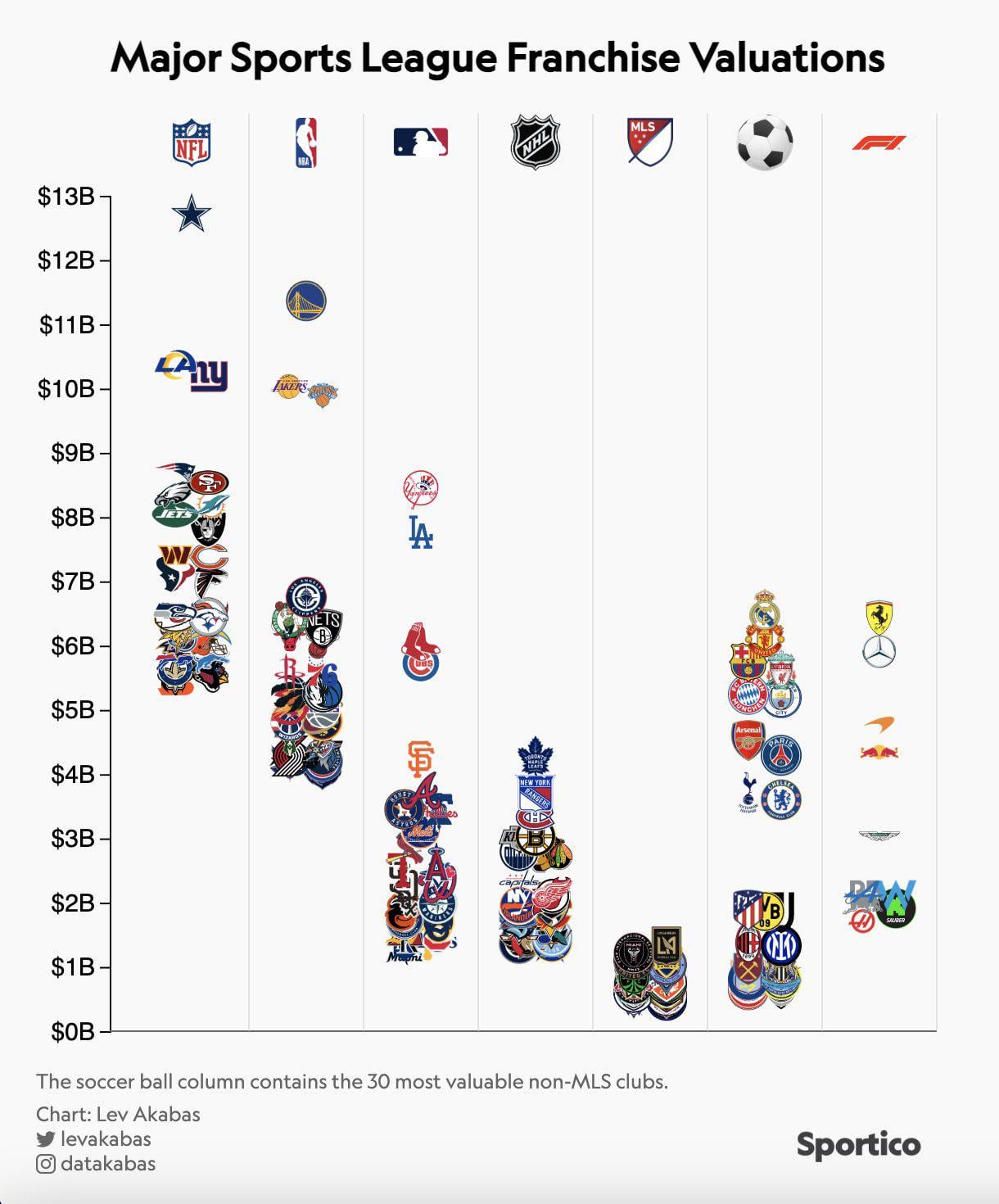 Worth noting that these are estimates with a lot of different data points going into it, including the size of the metropolitan region where the team exists, revenue, and even whether they own their stadium, all against actual franchise sales. The Lakers being sold for as much as they were sold for inflated the perceived value of basically any pro sports franchise in North America.