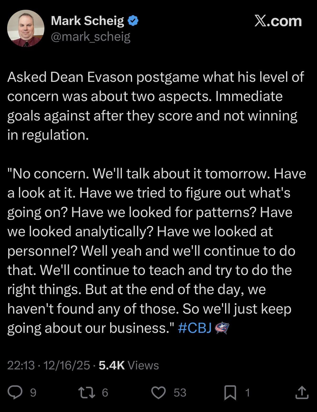 6. I’d recommend reading this. It’s a well thought out long piece that to summarize states, “There isn’t a single thing to point to.” This is a weird combination of a young team and bad luck. [https://pocketcbj.substack.com/p/diving-into-the-abyss-of-third-period?publication_id=1637914&post_id=180891312&action=share&triggerShare=true&isFreemail=true&token=eyJ1c2VyX2lkIjoxMDY2OTY1NiwicG9zdF9pZCI6MTgwODkxMzEyLCJpYXQiOjE3NjU1NzU0MjQsImV4cCI6MTc2ODE2NzQyNCwiaXNzIjoicHViLTE2Mzc5MTQiLCJzdWIiOiJwb3N0LXJlYWN0aW9uIn0.zD1qXfKF1zCgm4ULRS9TNa7K7BYWlT3pPUg6Tpk292M&r=6corc&triedRedirect=true&utm_source=substack&utm_medium=email](https://pocketcbj.substack.com/p/diving-into-the-abyss-of-third-period?publication_id=1637914&post_id=180891312&action=share&triggerShare=true&isFreemail=true&token=eyJ1c2VyX2lkIjoxMDY2OTY1NiwicG9zdF9pZCI6MTgwODkxMzEyLCJpYXQiOjE3NjU1NzU0MjQsImV4cCI6MTc2ODE2NzQyNCwiaXNzIjoicHViLTE2Mzc5MTQiLCJzdWIiOiJwb3N0LXJlYWN0aW9uIn0.zD1qXfKF1zCgm4ULRS9TNa7K7BYWlT3pPUg6Tpk292M&r=6corc&triedRedirect=true&utm_source=substack&utm_medium=email)