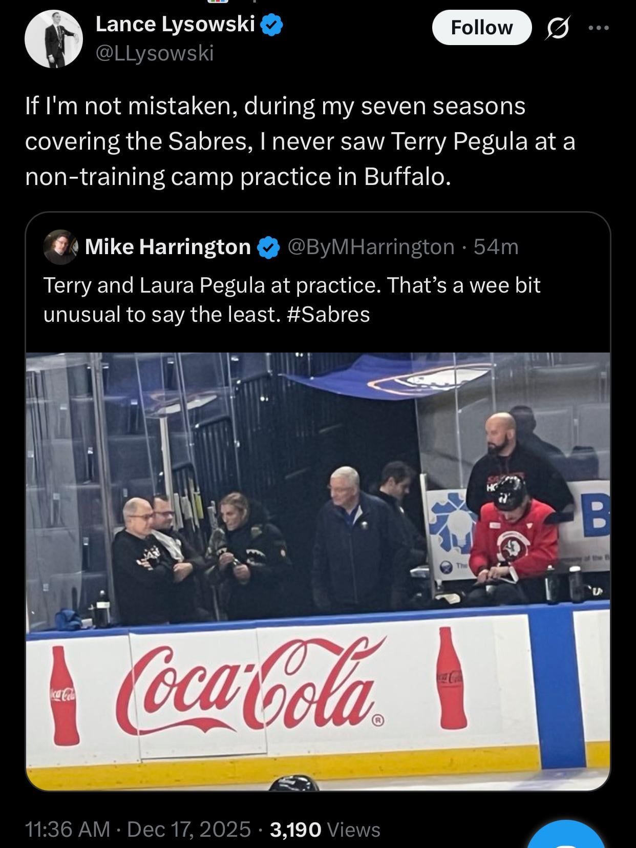 [Lance Lysowski] If I’m not mistaken, during my seven seasons covering the Sabres, I never saw Terry Pegula at a non-training camp practice in Buffalo.