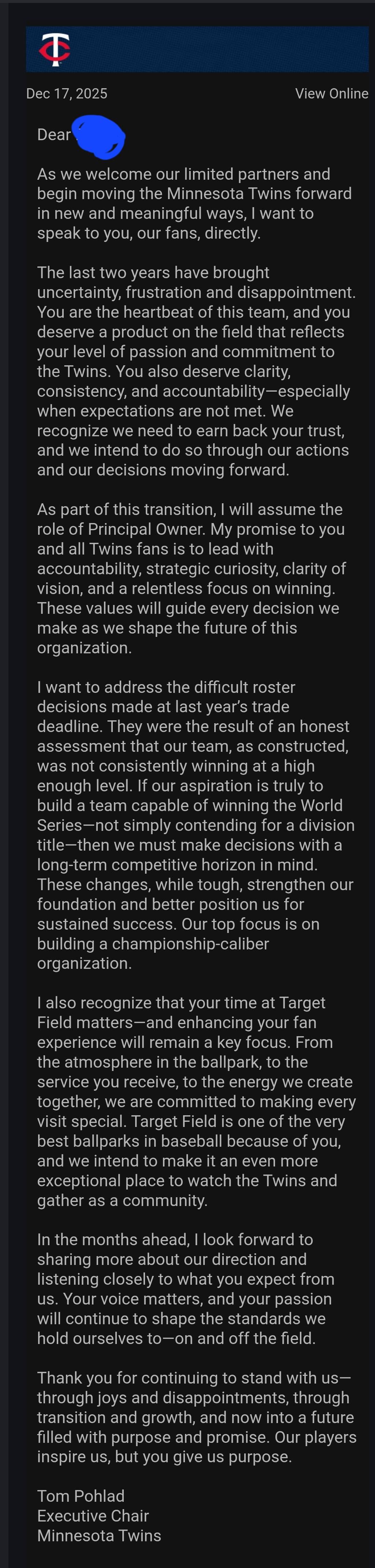 Got this email 10 mins ago from the Twins. Jim is no longer in charge. Not sure what this means for the team…