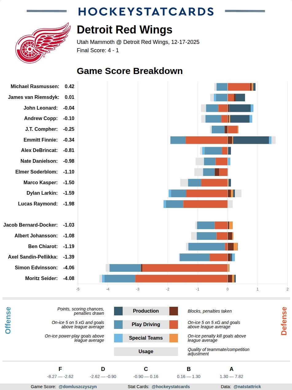 1. I think Seider’s rating was punished by our shit forwards and Ed’s bad play tonight. Maybe I missed it but I didn’t really see much bad play by him.