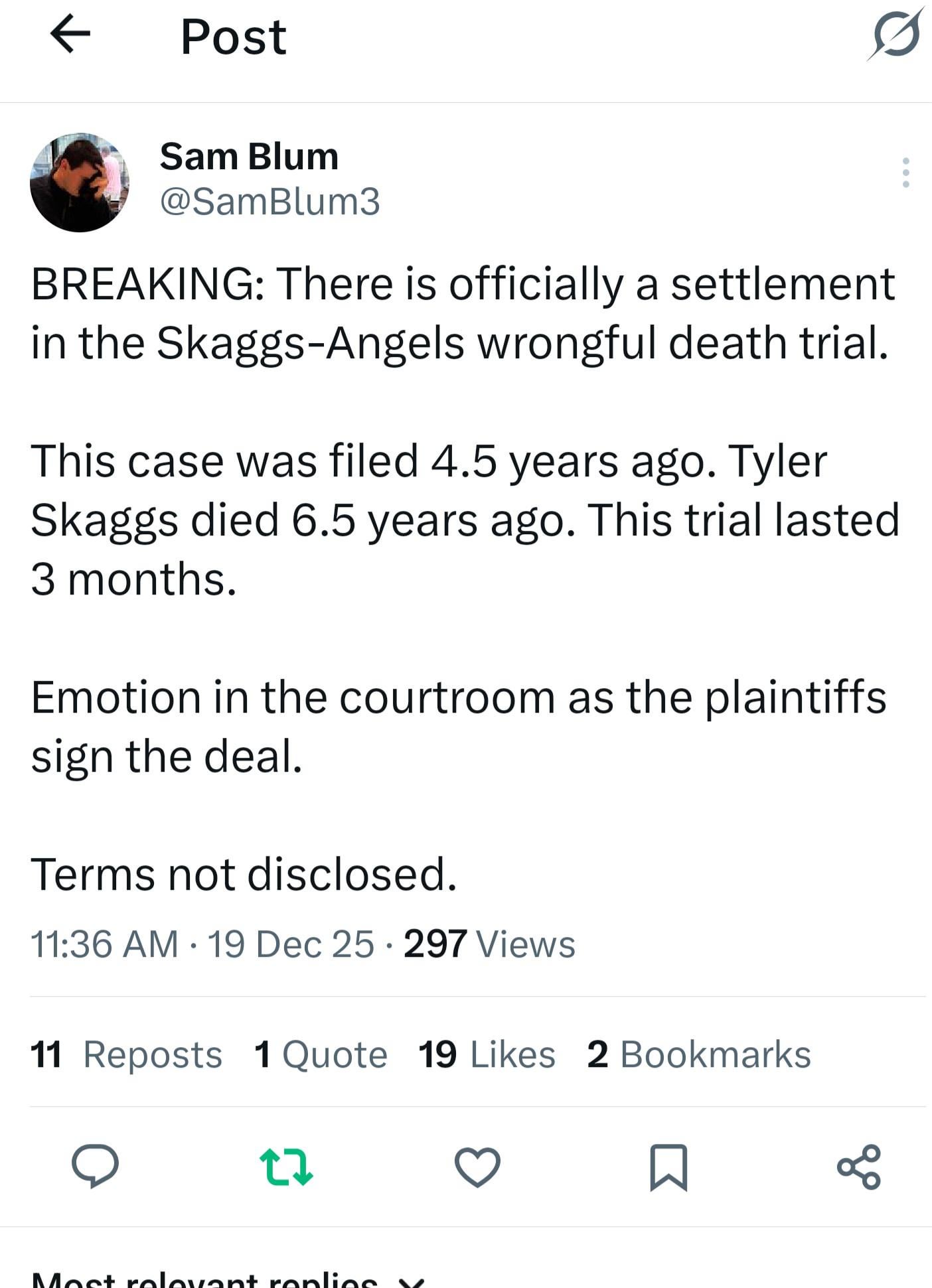 I have previously posted about the angels not having a general counsel to assist them in legal matters while all other teams have full legal teams. This settlement shows the angels need their own general counsel to advise on legal matters like this litigation. Settling this matter years ago would have protected the organization from a lot of embarrassment and put it behind them. Instead, the team likely spent hundreds of thousands of dollars, if not millions to try this case. On top of that, a lot of embarrassing stories came out about the organization where it became clear the front office was allowing a drug addict to have affairs with interns and run rampant and their start players were engaging in harrassment and hazing. The only reason the team settled is because they knew they were going to lose or else it would have made no sense to settle after the all embarrassment and money spent on this trial. What a terribly run organization….