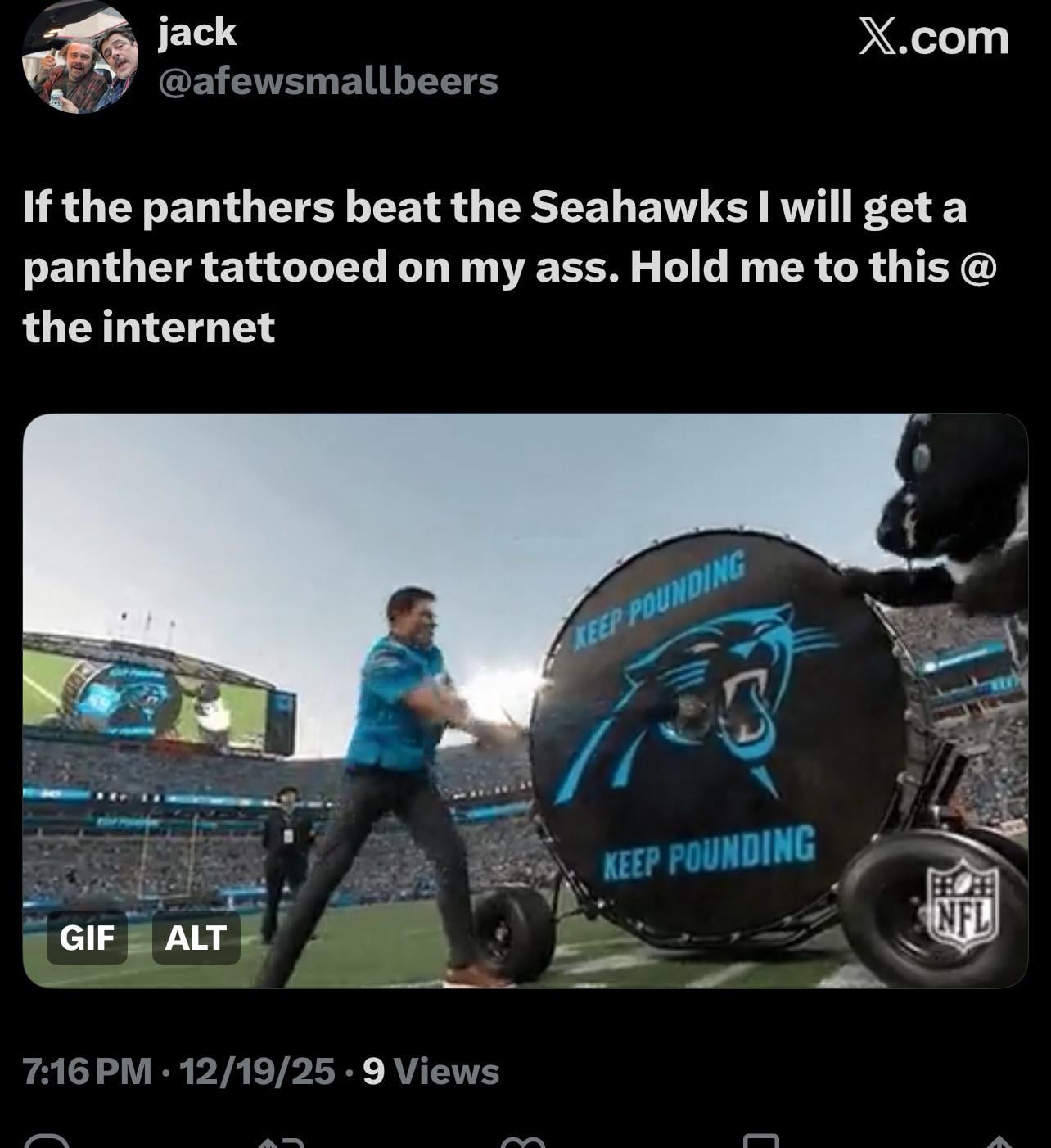 3. This reminds me of a Panthers/Rams game I went to in 2016 in LA. Back in the nosebloods at the Memorial Coliseum there was a dude who kept mooning the crowd to show the Panther tattoo on his ass any time we did anything positive.