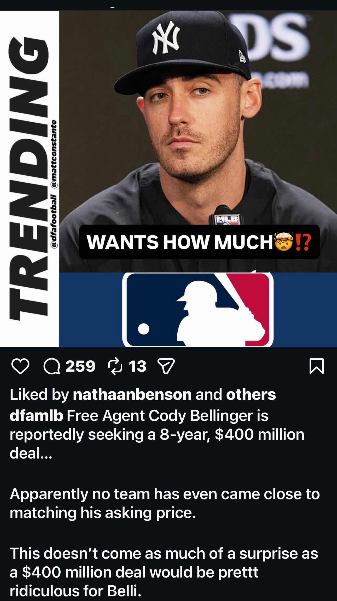 “Scott Boras said my report about Bellinger asking for $400m was “nonsense” and asked me to retract it,” Bloom wrote on X. “In immense respect to him and our decades-long relationship and despite my very credible source, consider it retracted. He didn’t give me a replacement figure.”