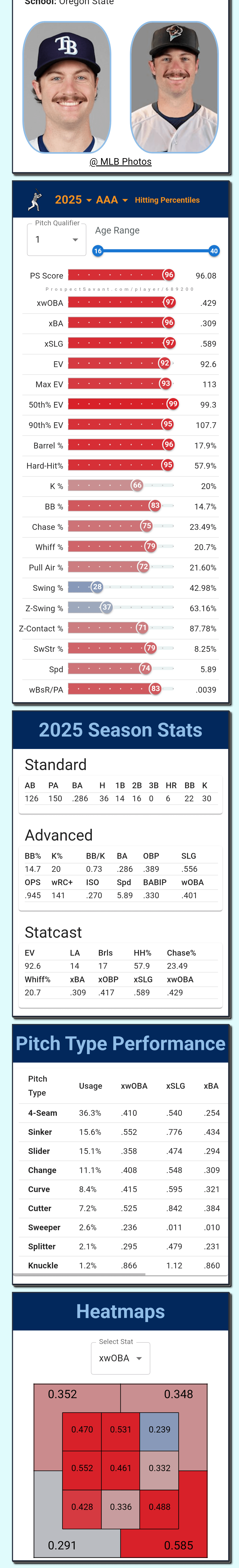 melton has great barrels and EV although he struggled in the majors last year. And he doesn't have to sacrifice a high whiff rate to achieve those barrels which to me is super high end potential. Project his doubles and homers and he has 50 plus double and 20 plus homer potential over a full season.