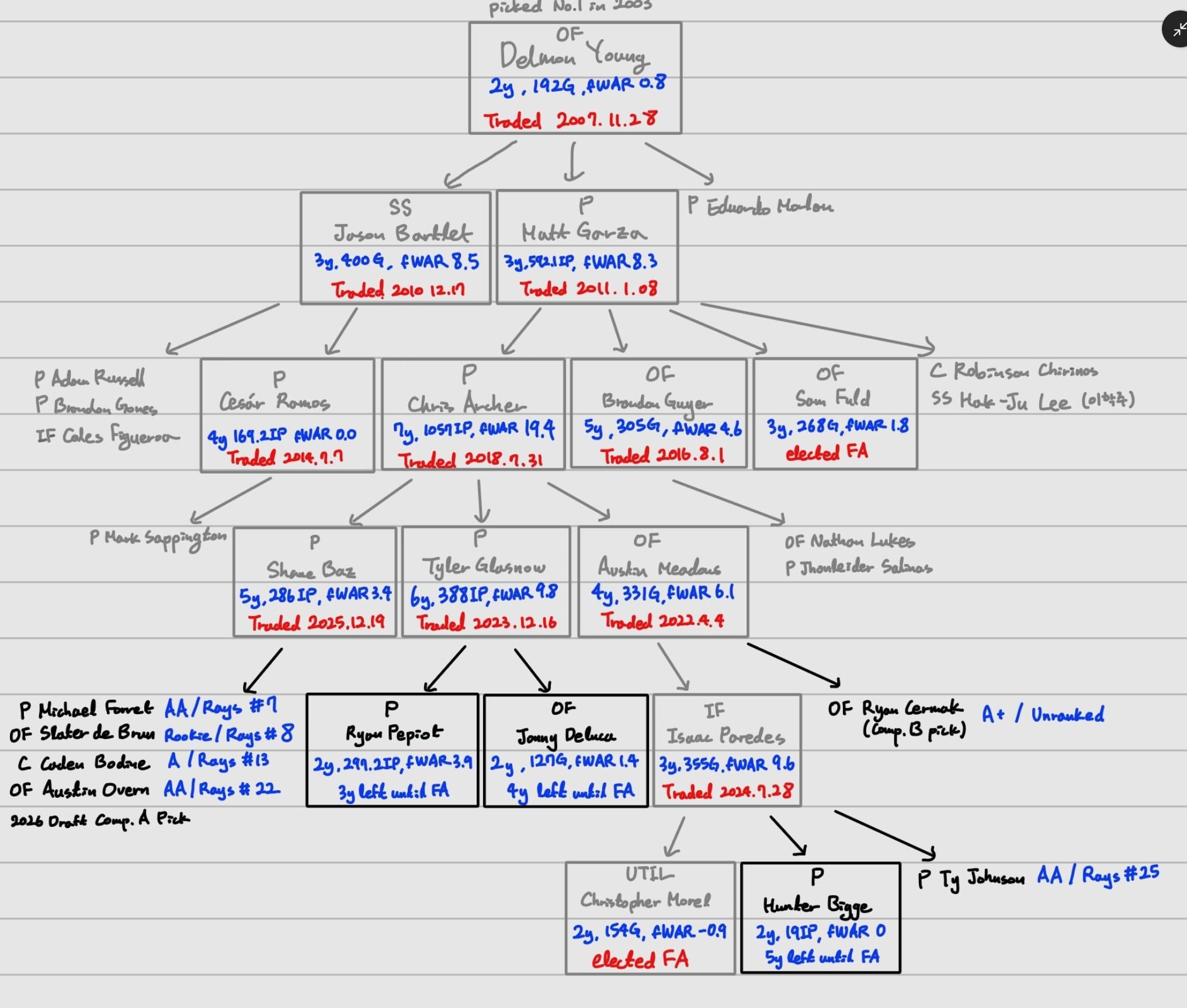 Gray text means that the player left the Rays organization. Box means the player has played in the big league as a Ray. There are 9 player and 1 pick in remaining in the organization in the tree.