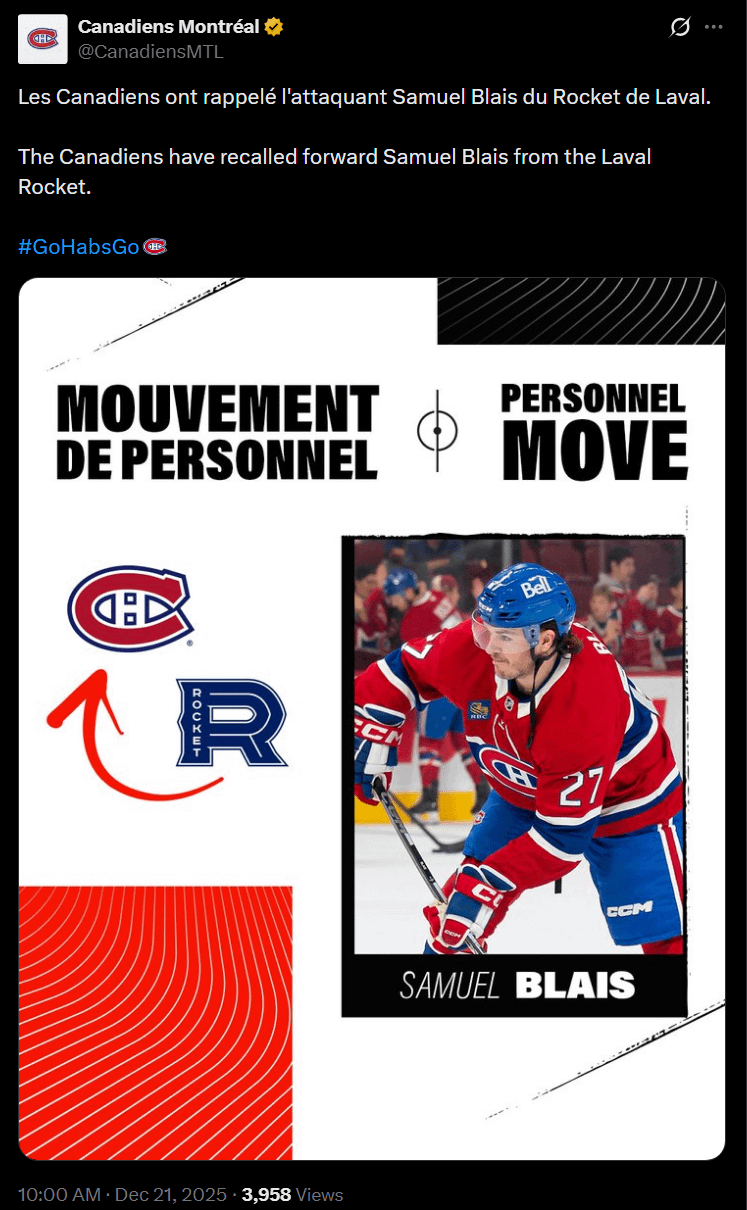 The Canadiens have recalled forward Samuel Blais from the Laval Rocket.