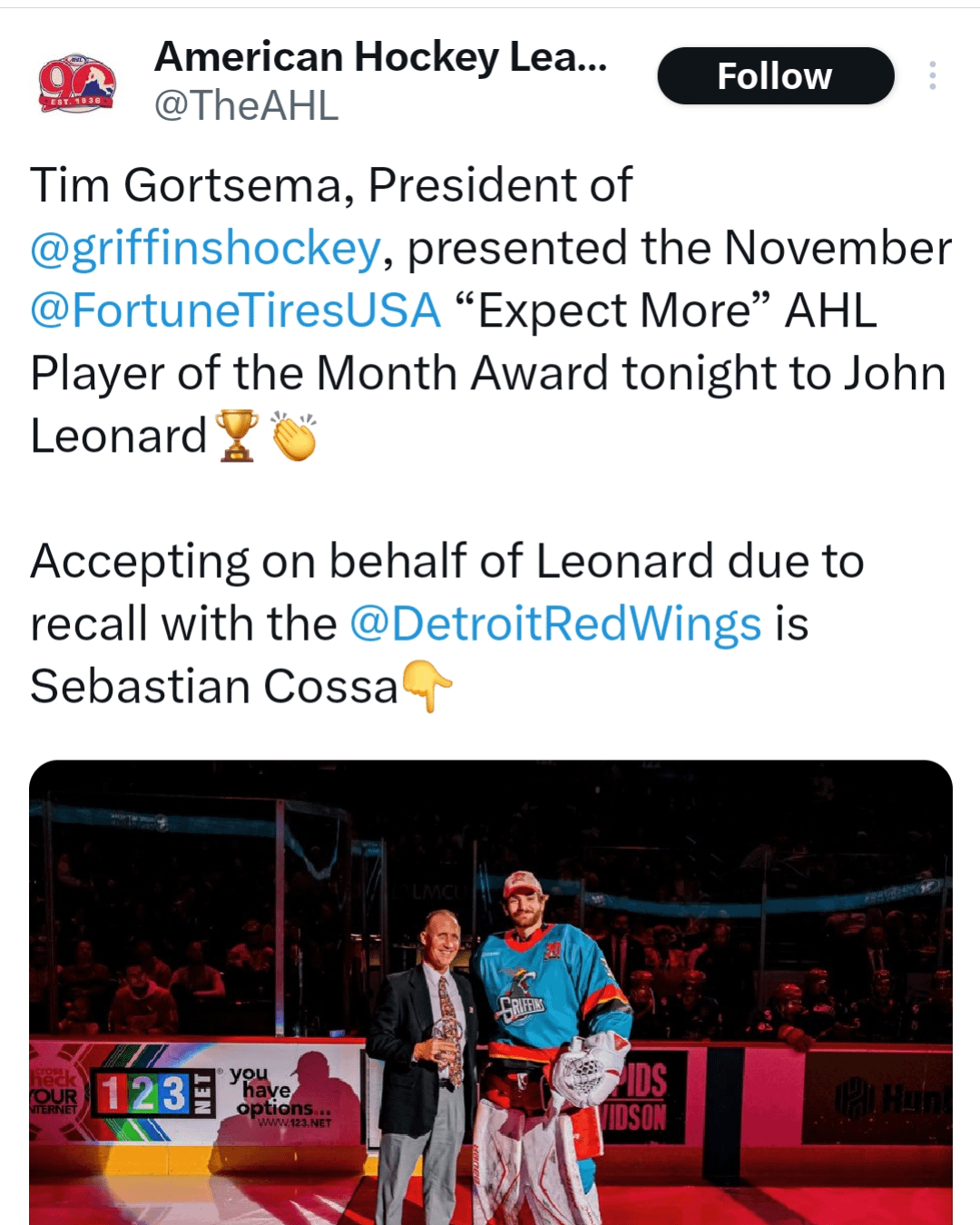 Not only does Leonard have 2 goals and 3 points in his 4 Red Wings games played this season, but he was also presented with his November AHL Player of the Month Award yesterday. Congratulations John!!