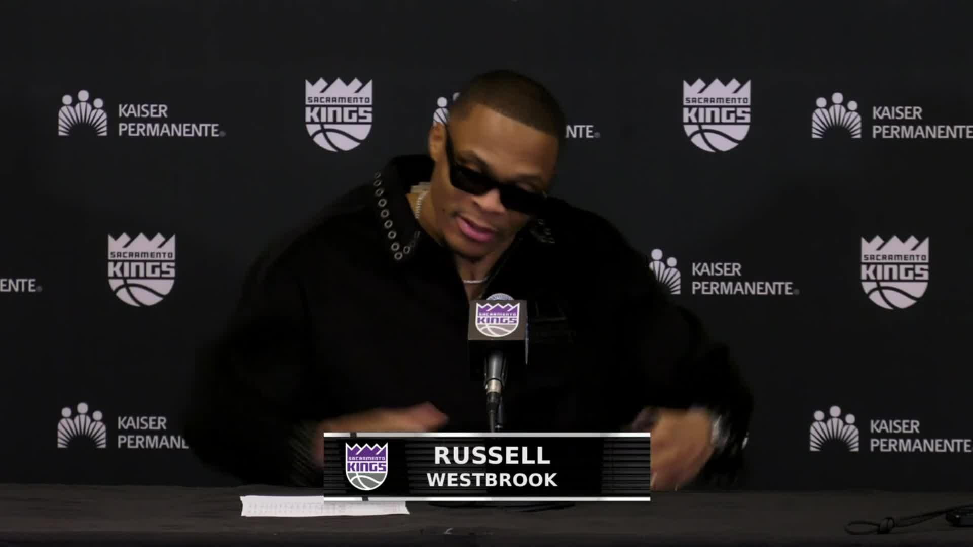 Russell Westbrook super hyped at the postgame conference, after the win against the Rockets.