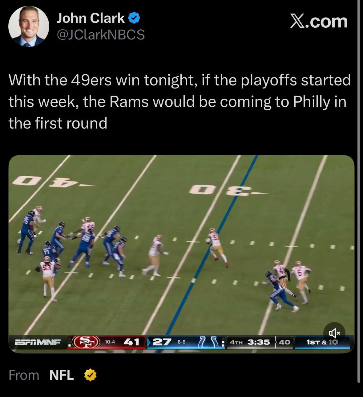 [Clark] With the 49ers win tonight, if the playoffs started this week, the Rams would be coming to Philly in the first round