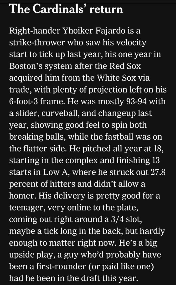 My point being, just because this guy is having glowing reviews right now doesn’t mean he’s guaranteed to be a star that the Sox traded away for peanuts. Hell, look at all the hype around Druw Jones and how his prospect rankings have dropped off a cliff.