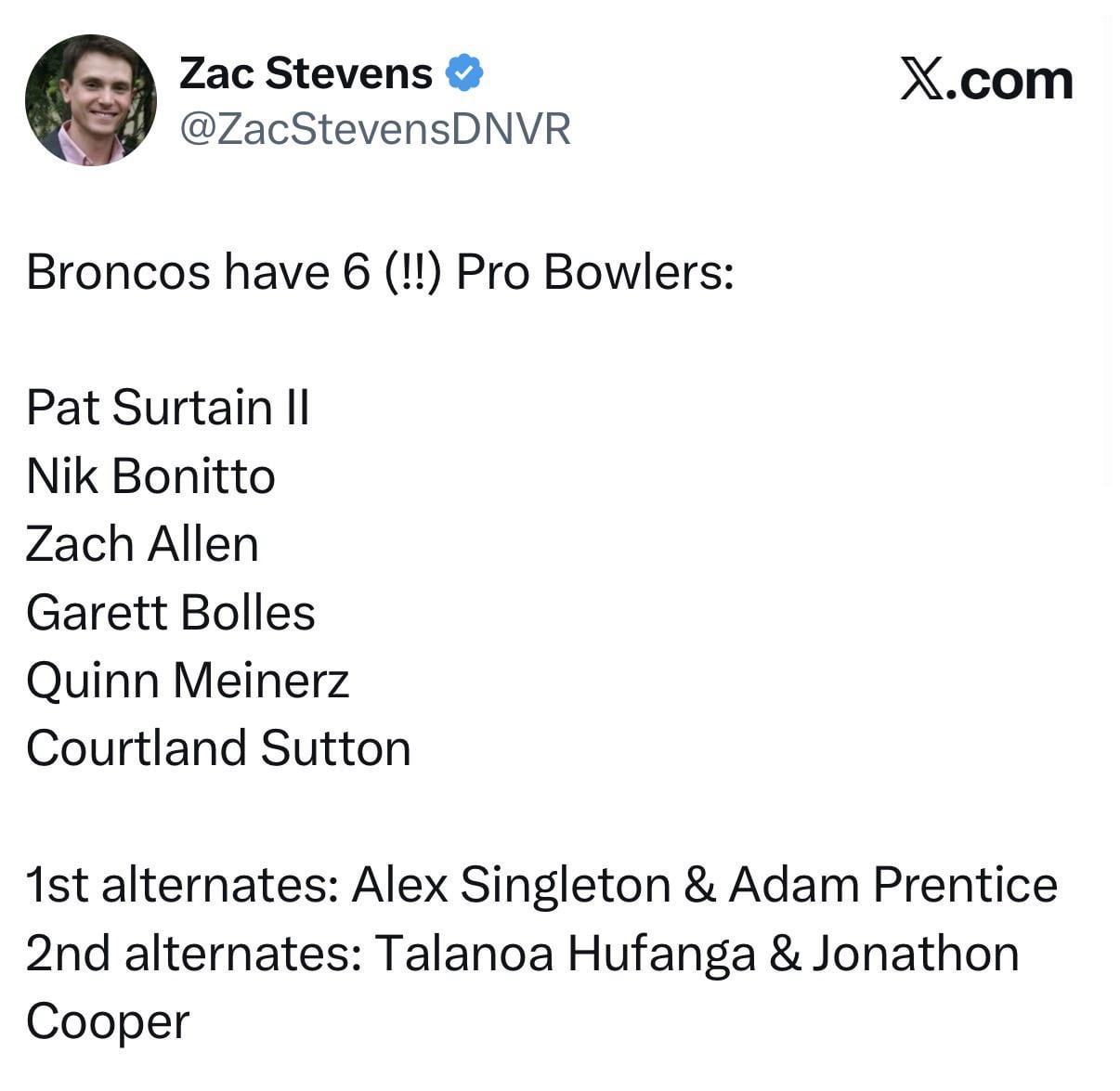 [Stevens] Broncos have 6 (!!) Pro Bowlers: Patrick Surtain II, Nik Bonitto, Zach Allen, Garrett Bolles, Quinn Meinerz, Cortland Sutton. 1st alternates: Alex Singleton & Adam Prentice. 2nd alternates: Talanoa Hufanga & Jonathon Cooper