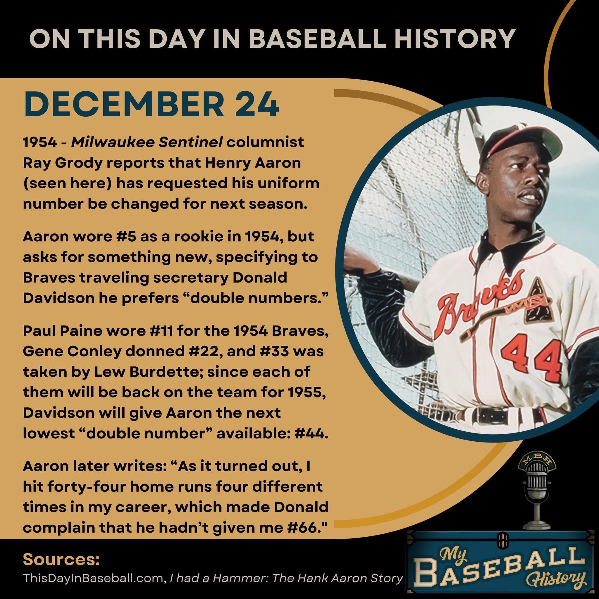 On This Day in Baseball History – December 24 2 comments There are only 10 single numbers though Hank Aaron was cool. Baseball is the best. Merry Christmas Eve to all. Leave a ReplyYou must be logged in to post a comment.