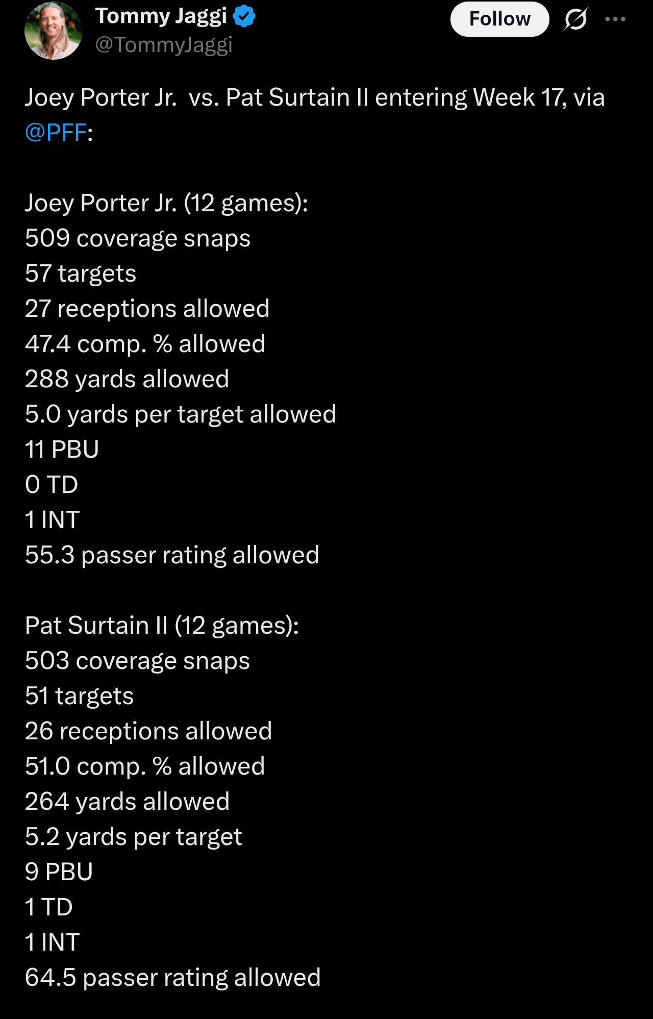 JPJ and Surtain have had 8 penalties each this season. Literally neck and neck statistically