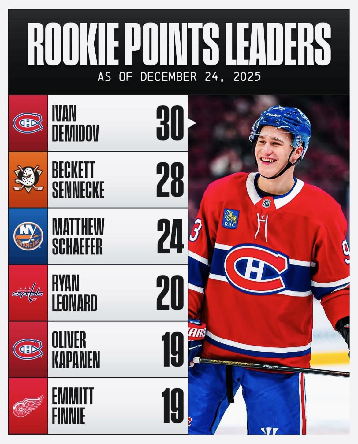 Ivan Demidov leads all NHL rookies in points at the Christmas break