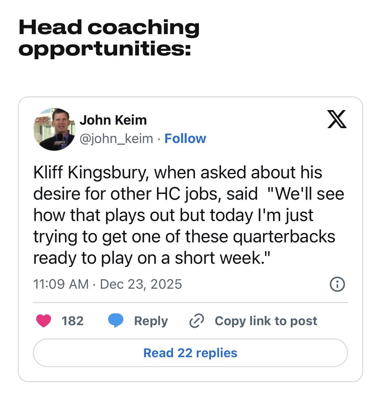 Kingsbury was asked about head coaching opportunities after the season, and he gave the typical answer of focusing on this week, and getting his QBs prepared for the Cowboys.